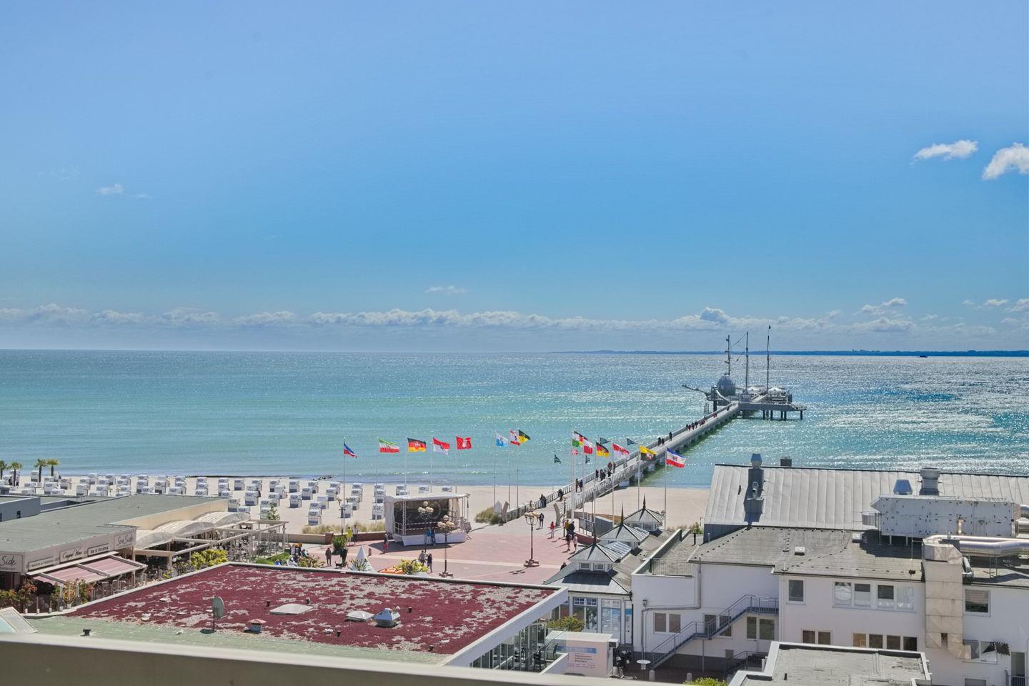 Schöne, helle Ferienwohnung mit möblierten Südbalkon und traumhaften Blick auf die bekannte Seebrücke von Grömitz, direkt an der Promenade.