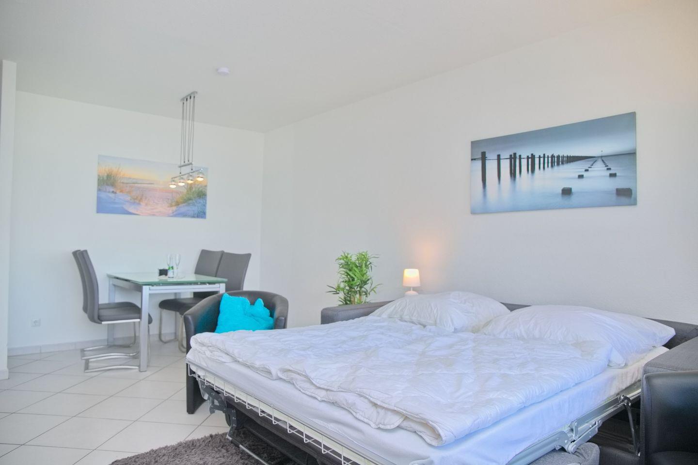 Der helle Wohnbereich ist mit einer gemütlichen Schlafcouch (140x190 cm), zwei bequemen Sesseln sowie einem Flatscreen-TV und Radio mit CD-Funktion ausgestattet – perfekt für entspannte Stunden nach einem Tag am Strand. Die offene Küche bietet alles, was Sie für die Selbstverpflegung benötigen: Cerankochfeld, Kühlschrank mit Gefrierfach, Mikrowelle, sowie Kaffeemaschine, Wasserkocher und Toaster.