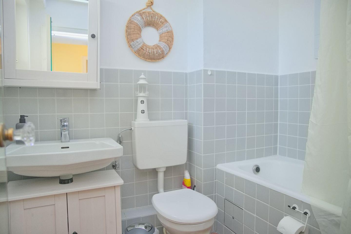 Das Badezimmer bietet alles, was Sie für Ihre tägliche Pflege benötigen: eine Badewanne mit integrierter Duschvorrichtung, ein Waschbecken mit praktischem Unterschrank, einen Spiegelschrank sowie ein WC.