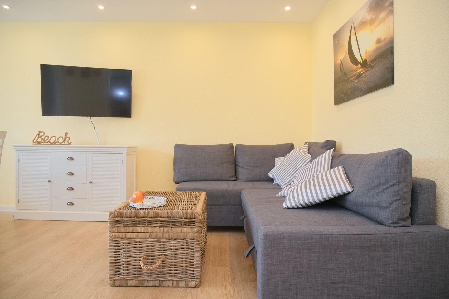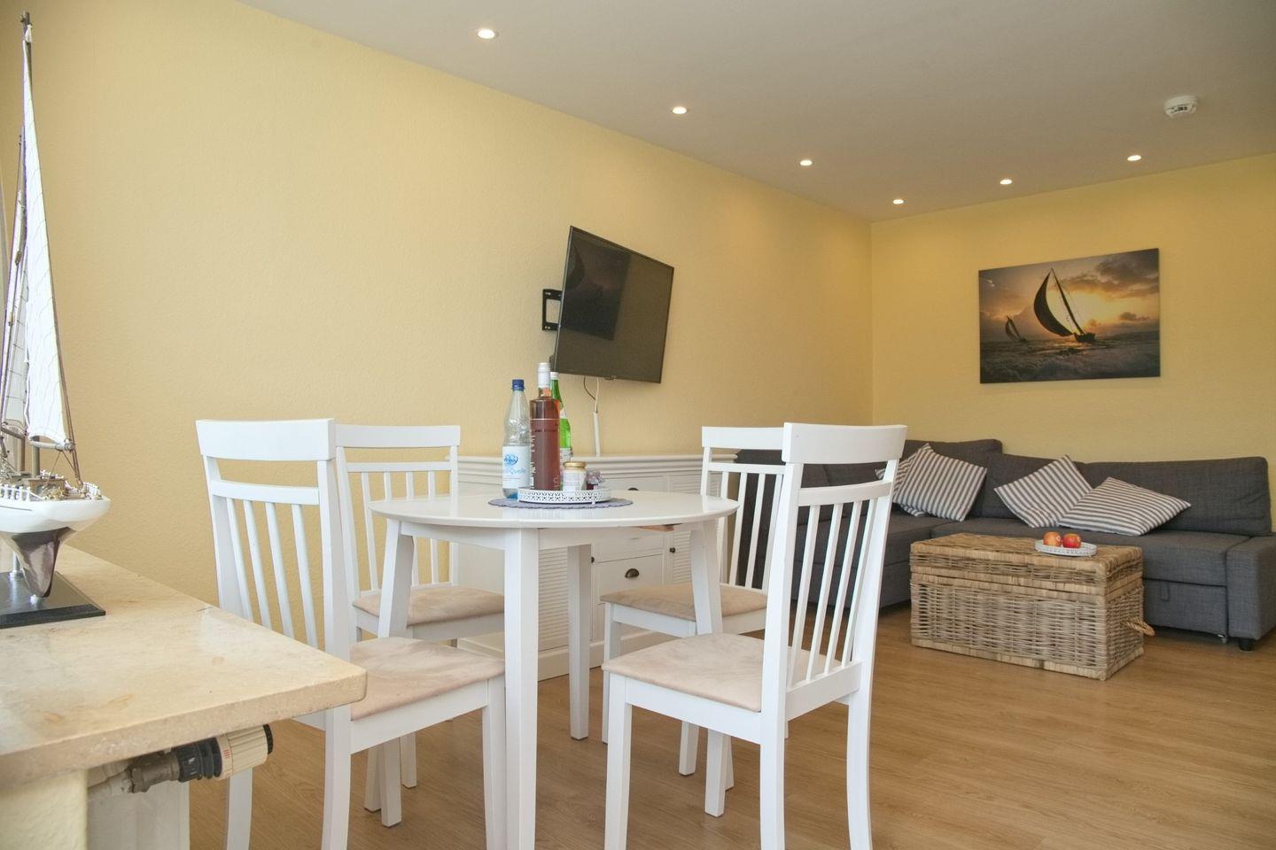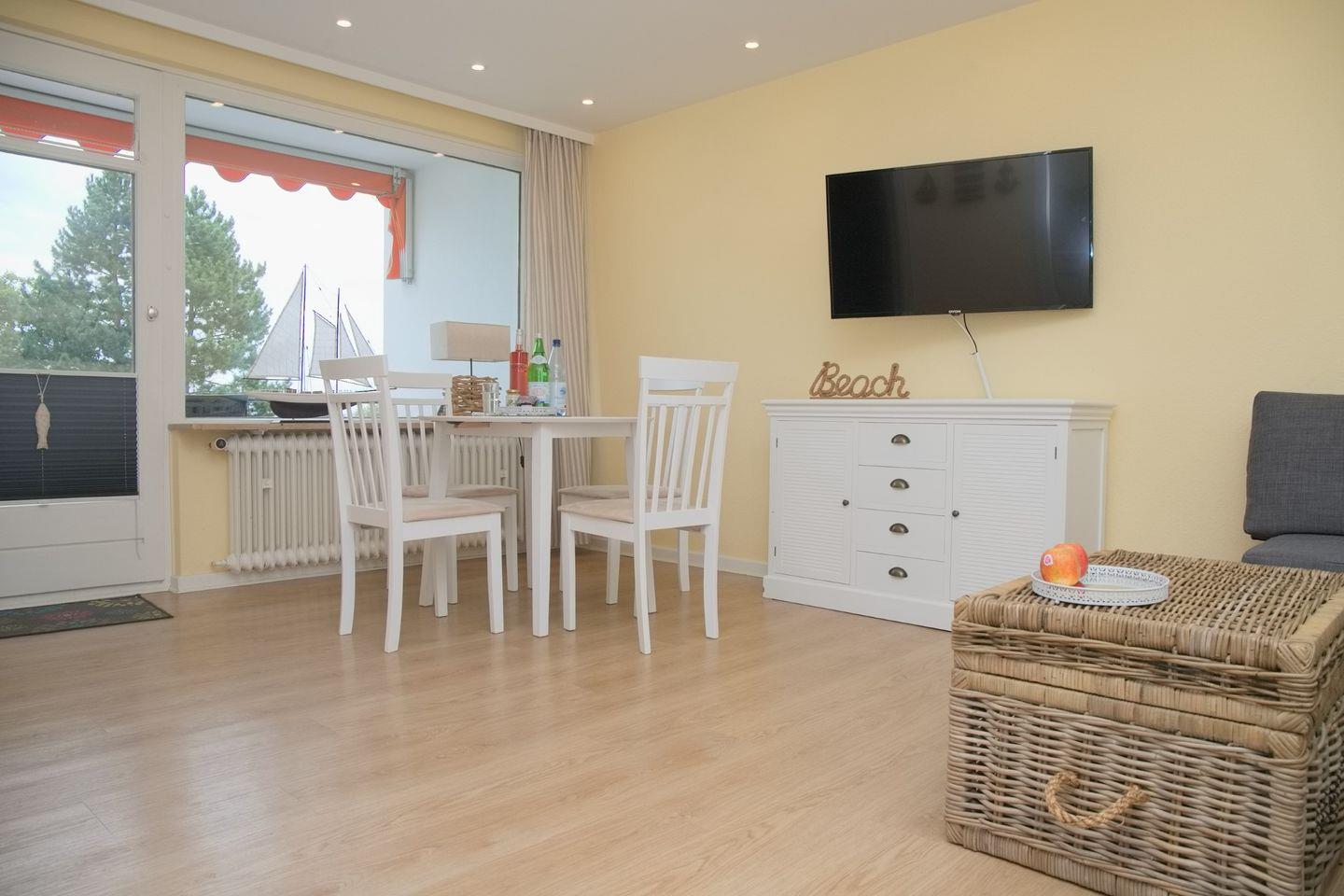 Das helle Wohnzimmer ist der Mittelpunkt der Wohnung. Hier erwartet Sie eine bequeme Couchgarnitur, die zum Entspannen nach einem langen Strandtag einlädt. Für gemütliche Fernsehabende steht Ihnen ein moderner Flachbild-TV mit einem Amazon Fire TV-Stick zur Verfügung. Der angrenzende Essbereich ist mit einem stilvollen Tisch und vier Stühlen ausgestattet – ideal für gemeinsame Mahlzeiten oder Spieleabende. Vom Wohnzimmer aus haben Sie Zugang zum Balkon in Südlage, der mit einer Markise ausgestattet ist und somit sowohl bei Sonne als auch bei leichtem Regen genutzt werden kann.