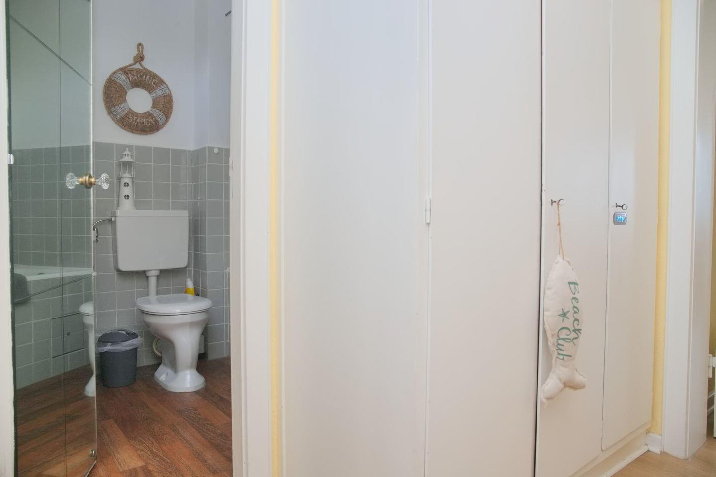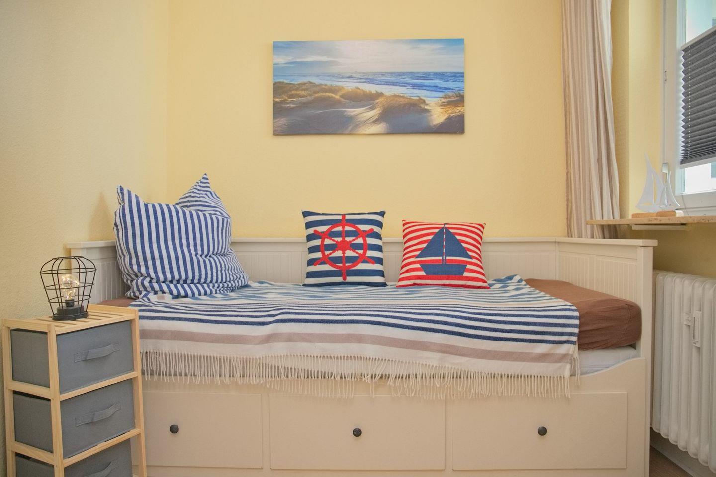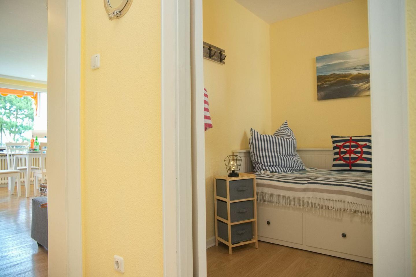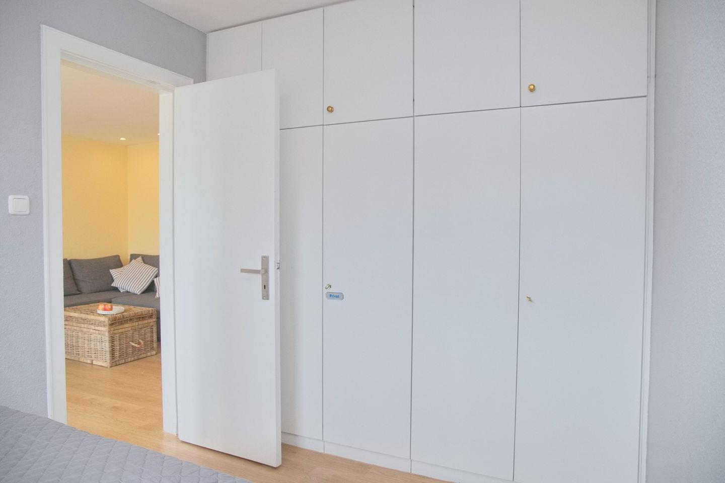 Die Wohnung verfügt über zwei Schlafzimmer. Das Hauptschlafzimmer ist mit einem komfortablen Doppelbett (Matratzengröße 160x200 cm) und einem großen Kleiderschrank mit Spiegeltüren ausgestattet, der viel Platz für Ihre Urlaubsgarderobe bietet. Im zweiten Schlafzimmer finden Sie ein Einzelbett (Matratzengröße 80x200 cm), das bei Bedarf zu einem Doppelbett ausgezogen werden kann. Ideal, wenn Sie mit Kindern oder Freunden reisen.