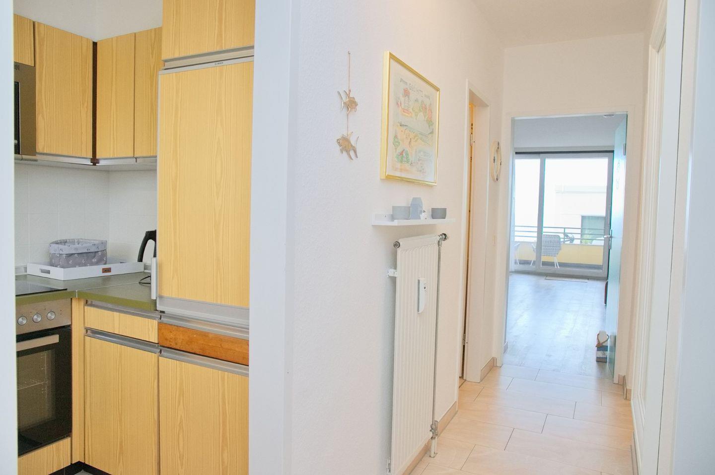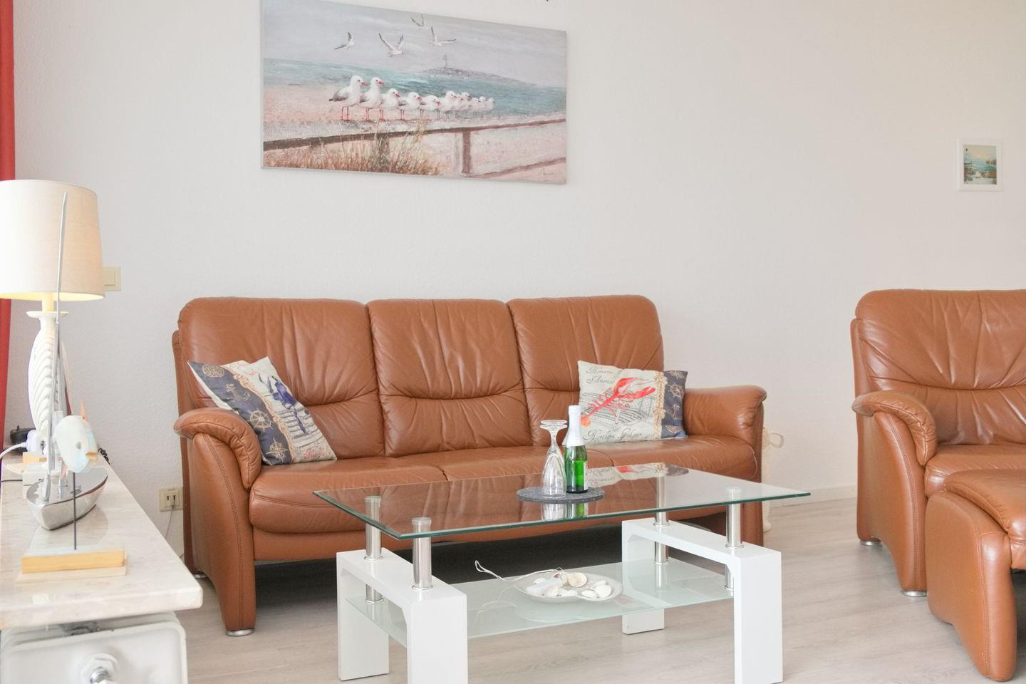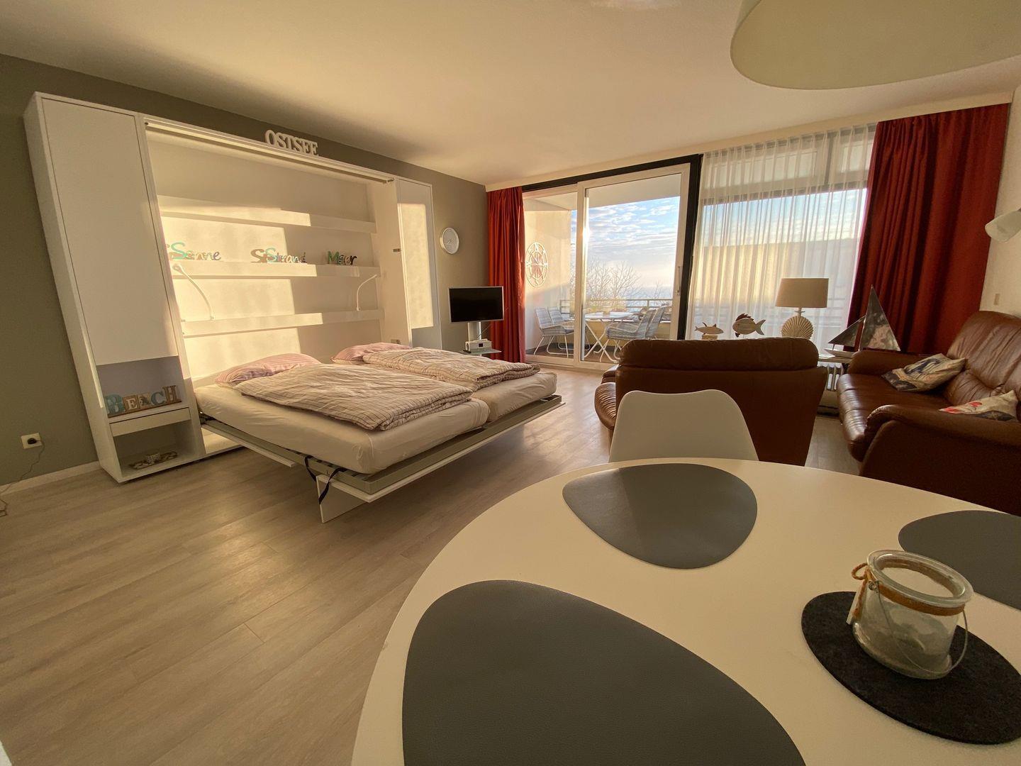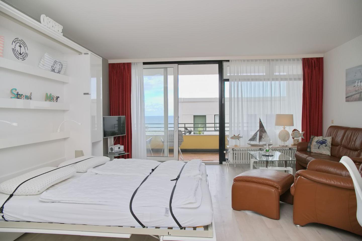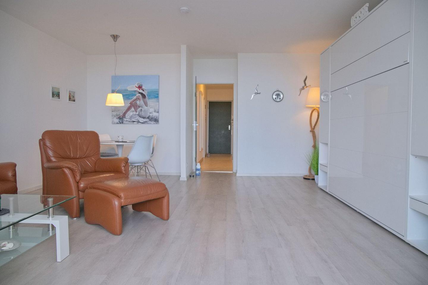 Der Wohnraum des Appartements bietet Ihnen eine gemütliche Ledercouch mit Sessel und Fußhocker, einen Flatscreen-TV und einen Essbereich. Ein Doppelschrankbett bieten einen zusätzlichen Schlafplatz für 2 Personen im Wohnzimmer. Die separate Küche verfügt über einen Geschirrspüler, Backofen, Ceranherd und Kaffeemaschine und ist somit mit allem ausgestattet, was das Urlaubsherz begehrt. Vom Wohnraum aus können Sie Ihren Balkon betreten, der im Sommer mit Gartenmöbeln ausgestattet ist. Auf gleicher Ebene finden Sie ein Schlafzimmer mit zwei Einzelbetten und Flatscreen-TV. Ein Badezimmer mit Dusche und WC komplettiert die Wohnung. Ein kostenfreier Strandkorb direkt am Strand bei der Vermietung Müller steht für das Jahr 2024 von April bis September zur Verfügung.