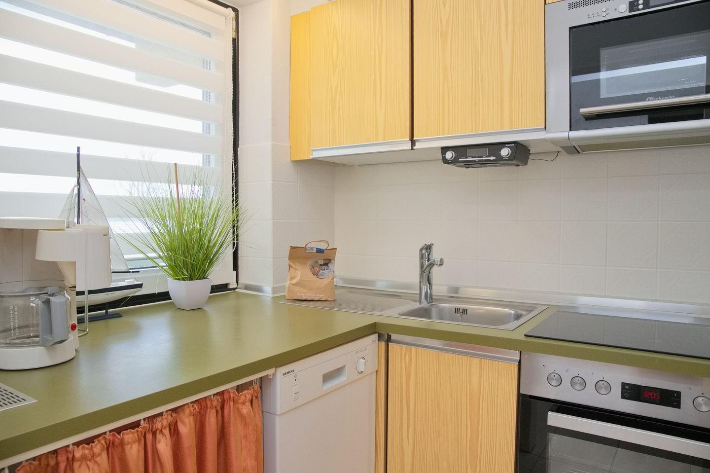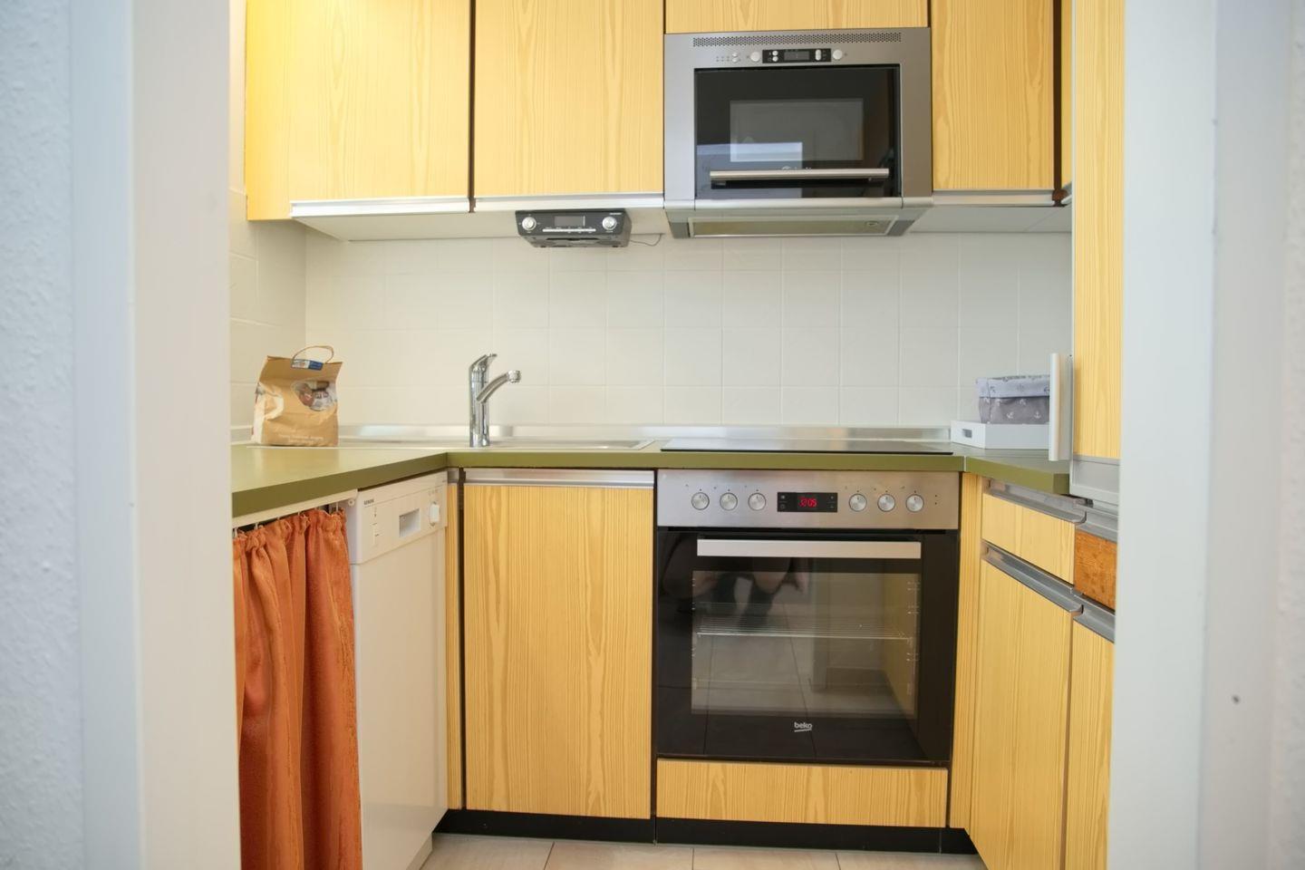 Wohnraum mit Flatscreen-TV und Radio, Küche mit Geschirrspüler, Backofen, Ceranherd, Filter-Kaffeemaschine, Balkon mit Gartenmöbeln, Schlafzimmer mit Flatscreen-TV, Badezimmer mit Dusche und WC. Waschmaschine und Trockner zur allgemeinen Nutzung im Haus.