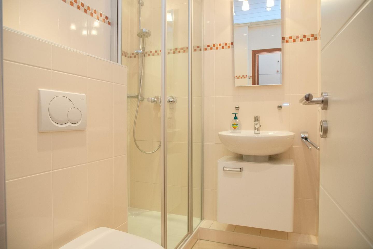 Im Bad befindet sich eine fast bodenebene Dusche, Waschbecken mit beleuchtetem Spiegel und WC sowie ein Handtuchheizkörper.