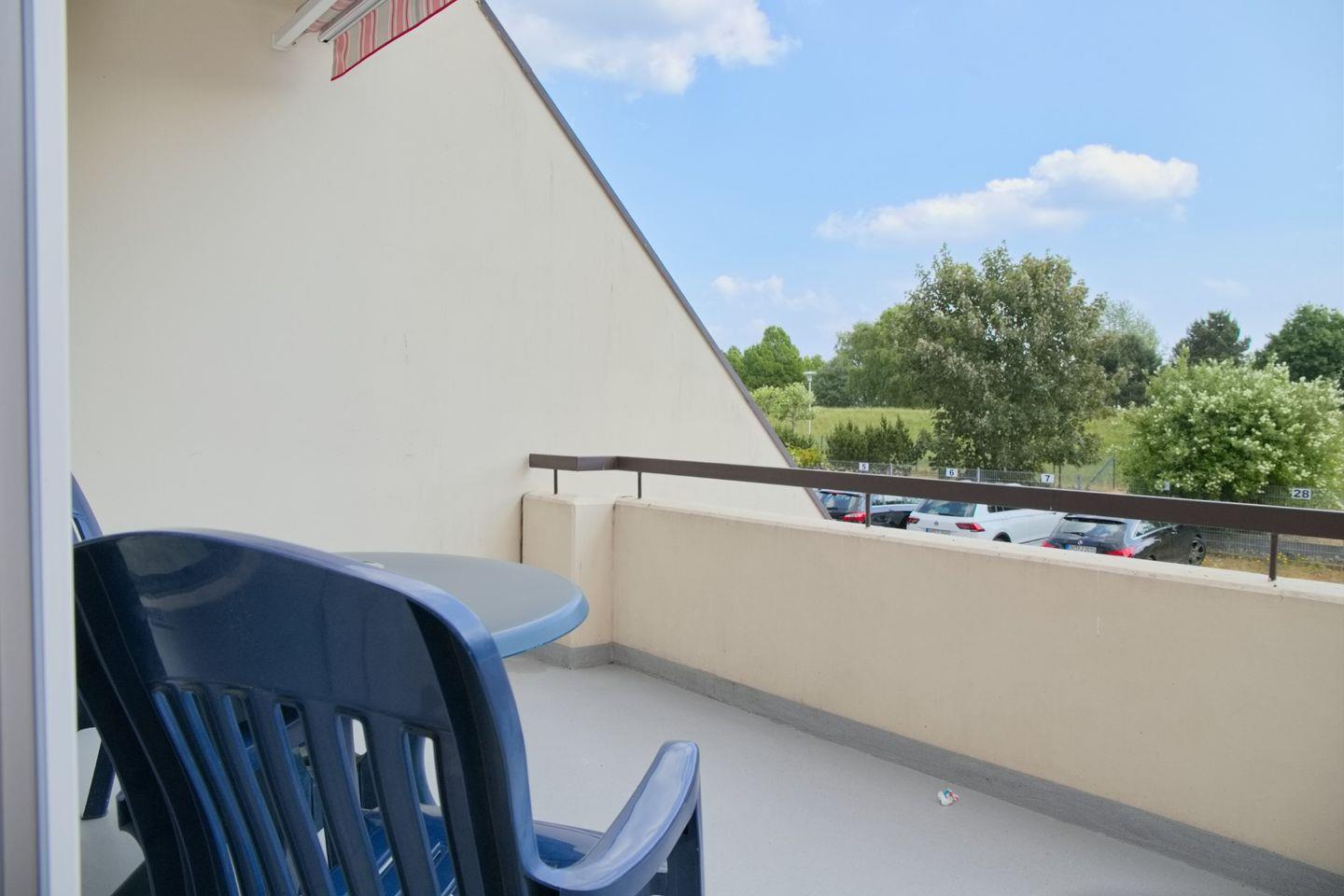 Für einen gemütlichen Tagesausklang lädt der Südbalkon mit Markise, einem Tisch und Stühlen ein.
