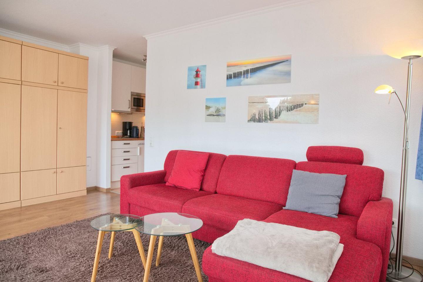 Im Wohnbereich lädt ein gemütliches Sofa sowie ein Schrankklappbett zum Träumen ein.