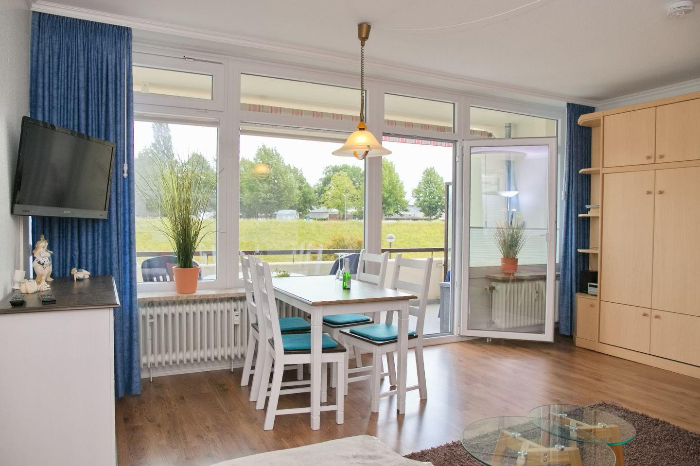 Einbauschrank, Esstisch, Flat-TV, Radio, Verdunkelungsvorhänge und Sichtschutzplissees runden die liebevolle Einrichtung des Appartements ab.