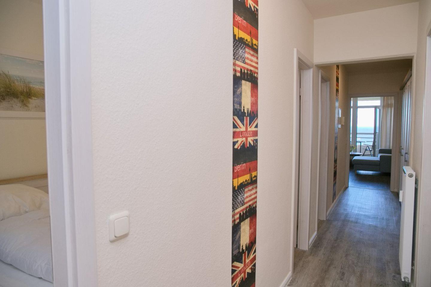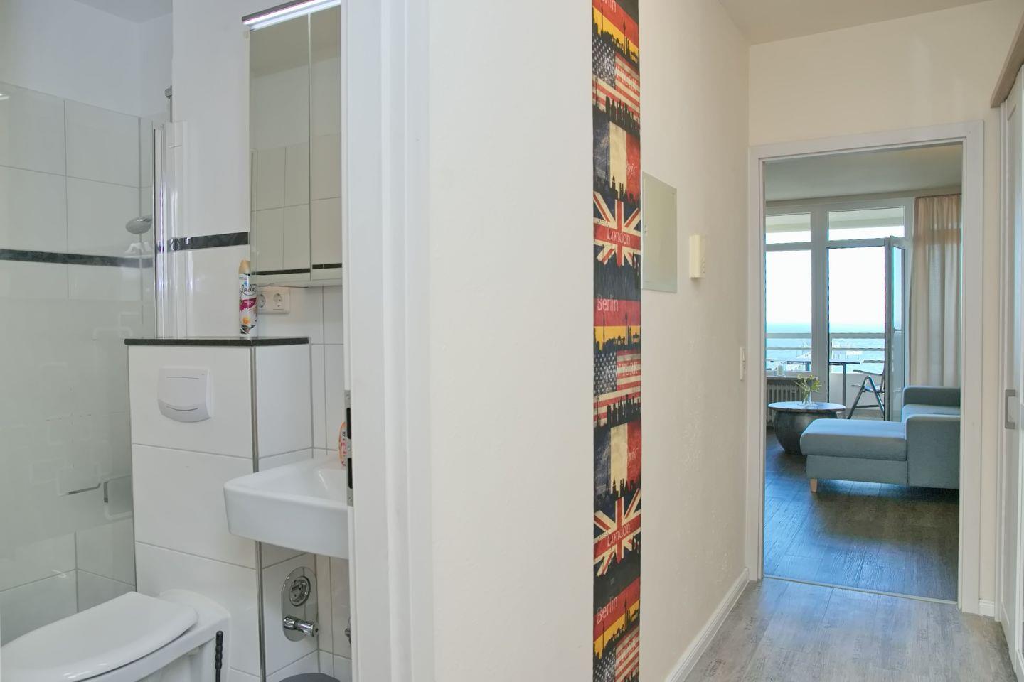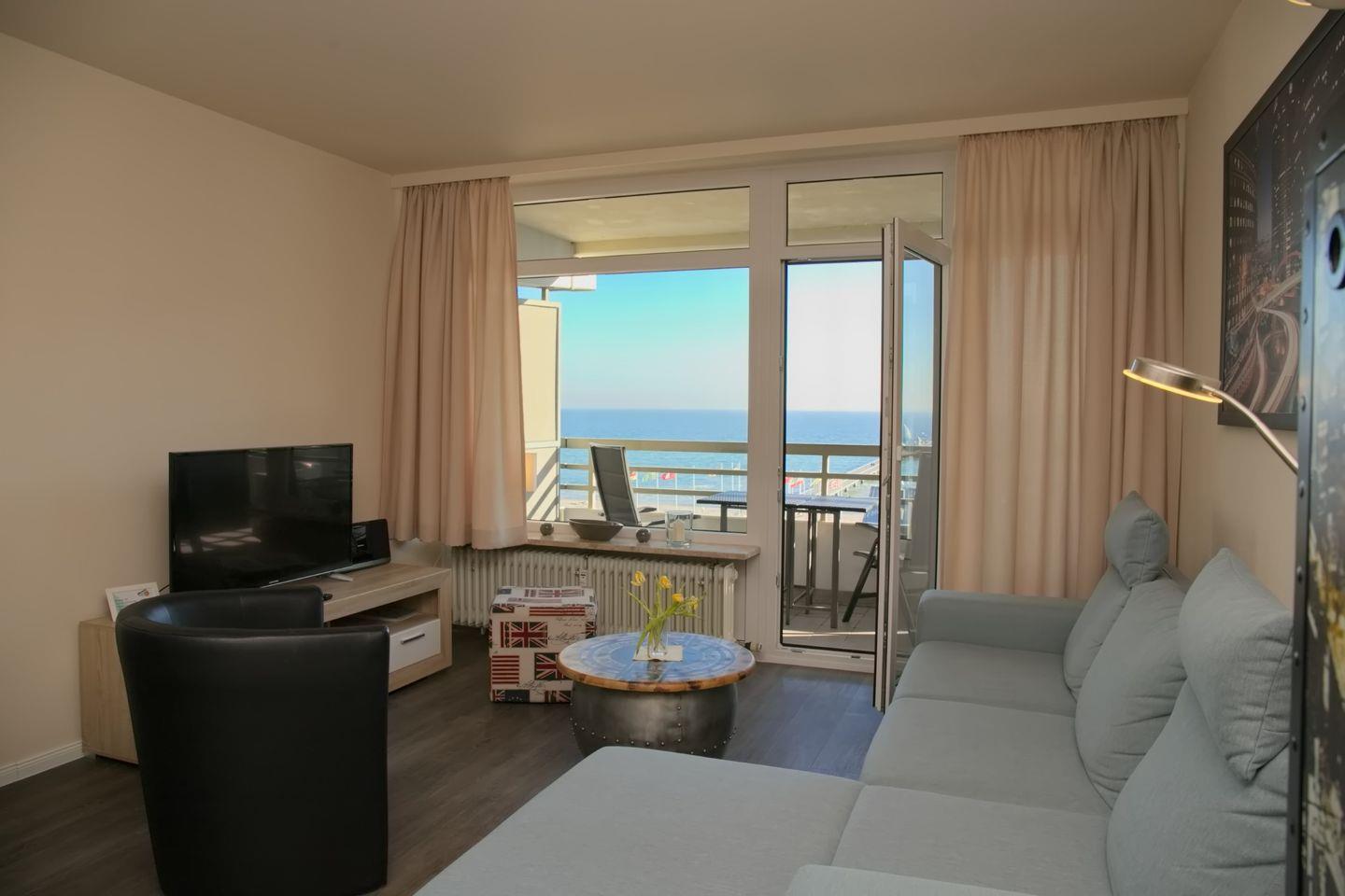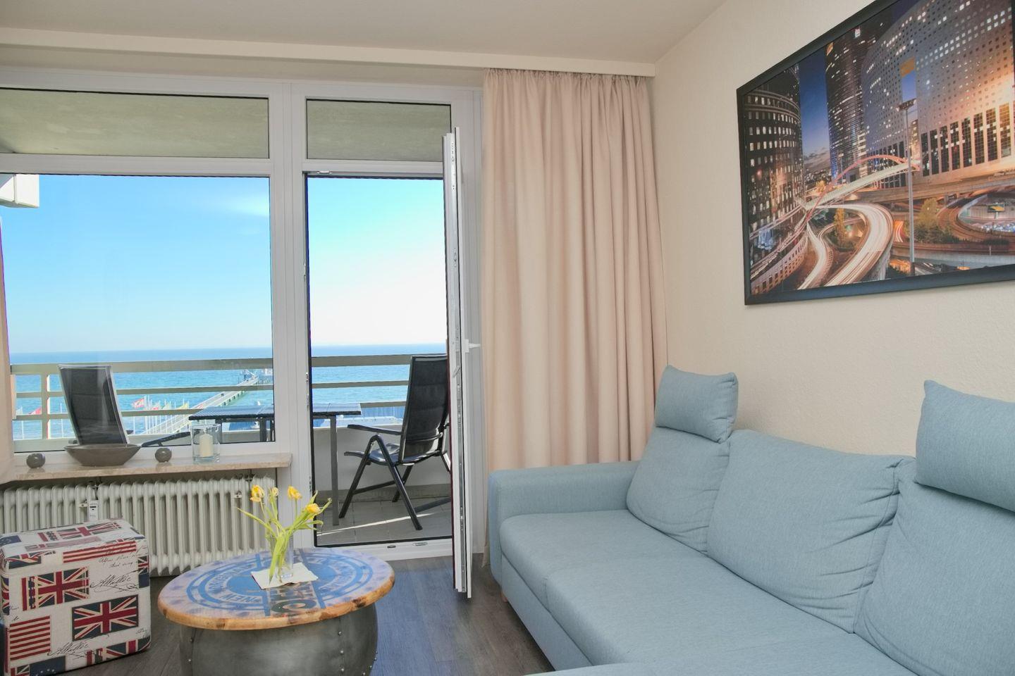 Diese sehr schöne 3-Zimmer-Wohnung (ca. 53 m²) für max. 4 Personen befindet sich in der 7. Etage mit Meerblick auf die Seebrücke. Der möblierte Balkon befindet sich in Südlage. Das Wohnzimmer verfügt über eine Eckcouch und Sessel, großen Flach-TV, CD/Radio mit USB sowie eine Essecke für 4 Personen. Die zum Wohnzimmer offene neue, moderne Einbauküche ist mit einem Cerankochfeld, Backofen, Geschirrspüler, Kühlschrank mit Gefrierfach sowie mit Toaster, Kaffeemaschine, Wasserkocher ausgestattet. Das Schlafzimmer ist ausgestattet mit einem Doppelbett (2 x 90 x 200 cm), sowie 2 Nachtschränke. Im Kinderzimmer stehen ein modernes Etagenbett und Sessel. Ein großer Kleiderschrank auf dem Flur bietet viel Stauraum. Das neue Badezimmer verfügt über eine ebenerdige Dusche