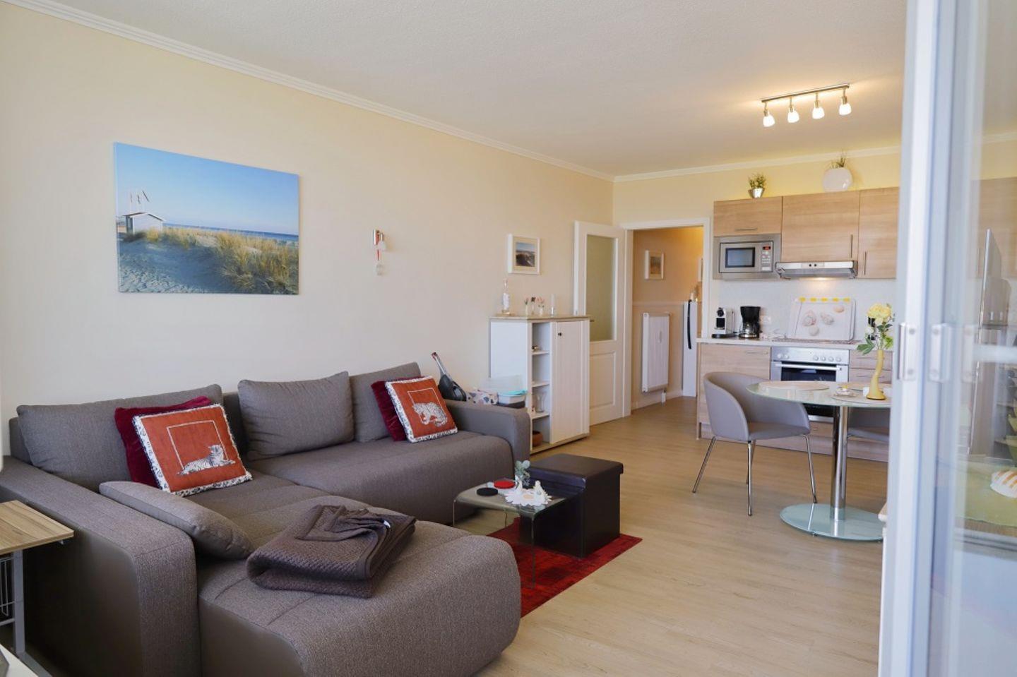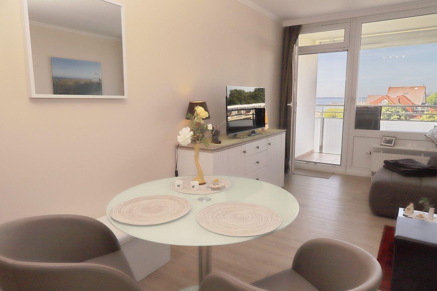 Moderne 2 Zimmer Ferienwohnung in der 5. Etage mit möblierten Süd/ Westbalkon und Markise und direkter Meerblick. Nur ein Steinwurf vom Meer entfernt.