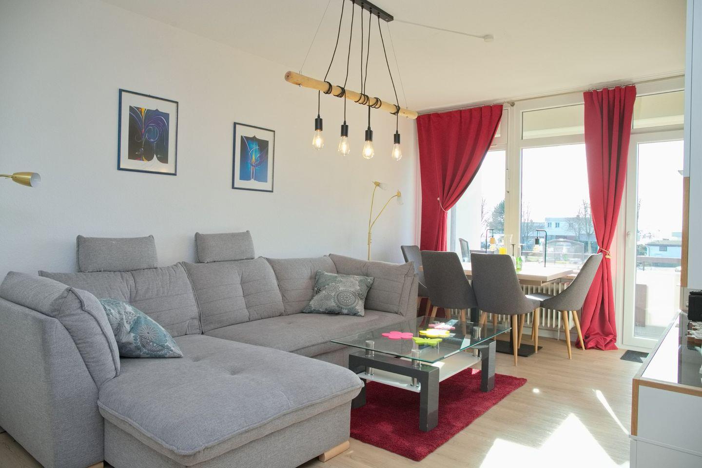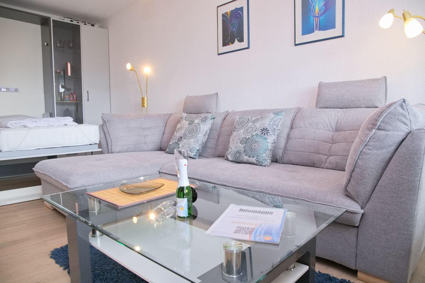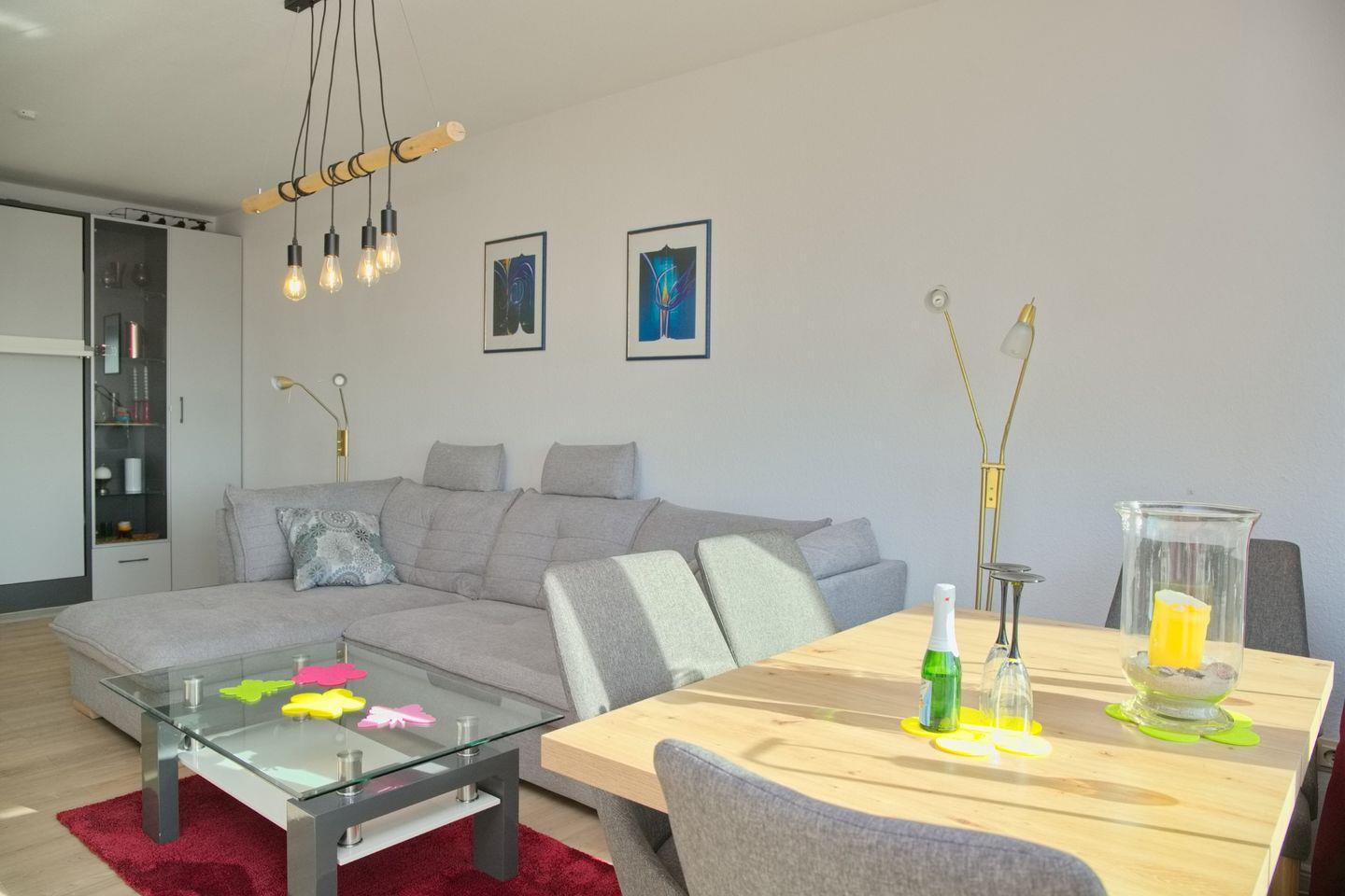 Moderne 2-Zimmer Ferienwohnung mit Südbalkon nahe der Seebrücke in Grömitz, ideal für Paare und kleine Familien.