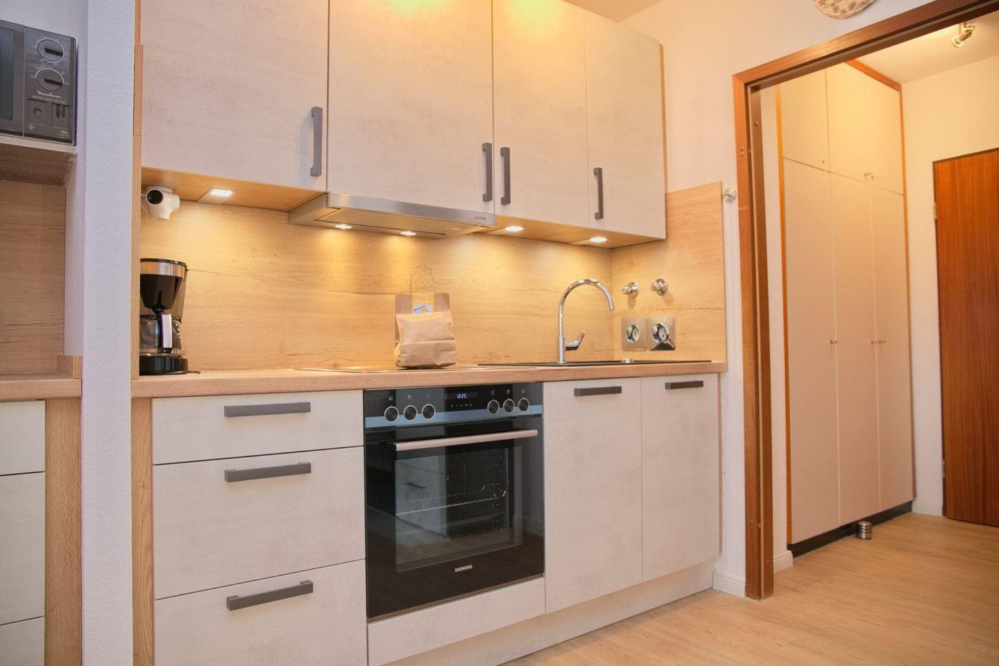 Die Küche ist voll ausgestattet mit einem Kühlschrank, einem Herd, einem Backofen, einem Wasserkocher und einer Kaffeemaschine, so dass Sie Ihre eigenen Mahlzeiten zubereiten können.