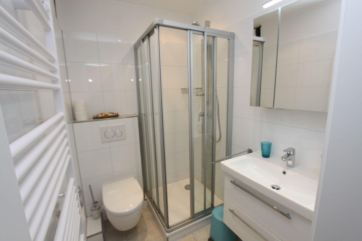 Zurück auf den Flur geht es weiter in das Duschbad mit WC, Waschbecken und Spiegelschrank.