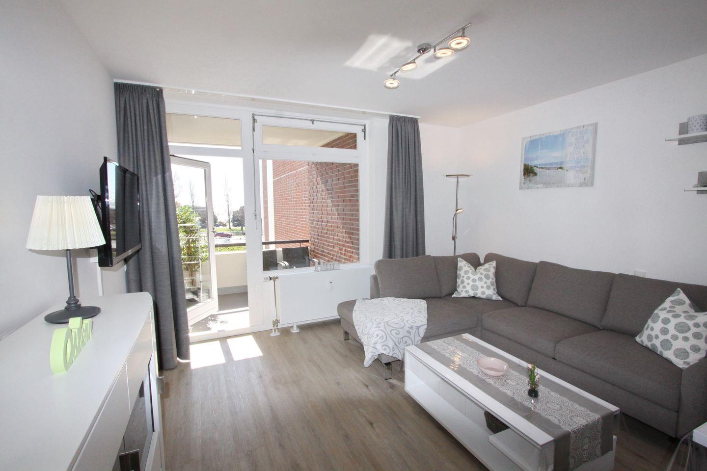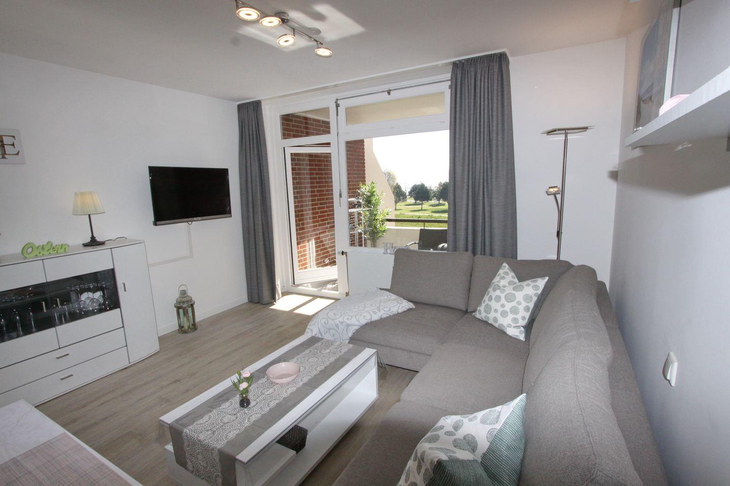 Im Wohnbereich steht Ihnen eine Schlafcouch zur Verfügung. Ein Flach TV und eine Stereoanlage stehen zur Unterhaltung bereit. Genießen Sie ihr Frühstück auf dem 2. Balkon in Südausrichtung und Teilseeblick.