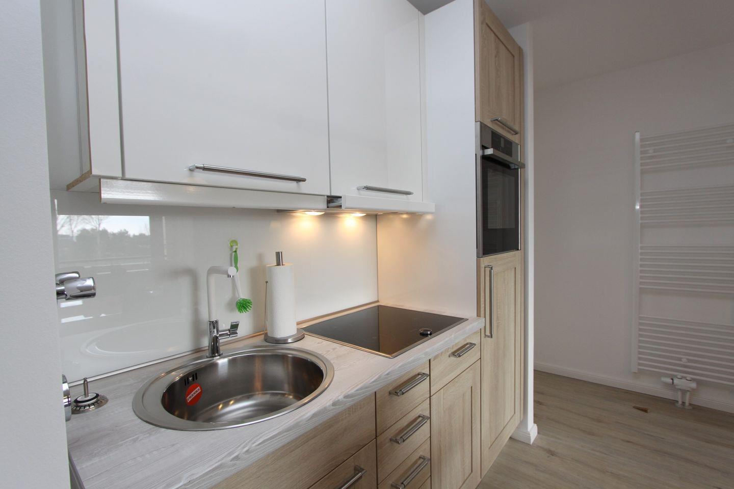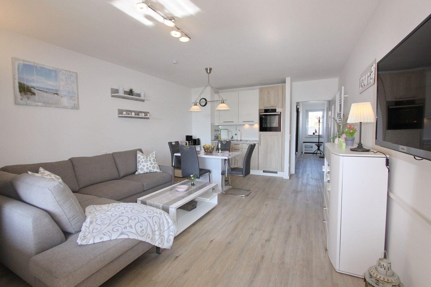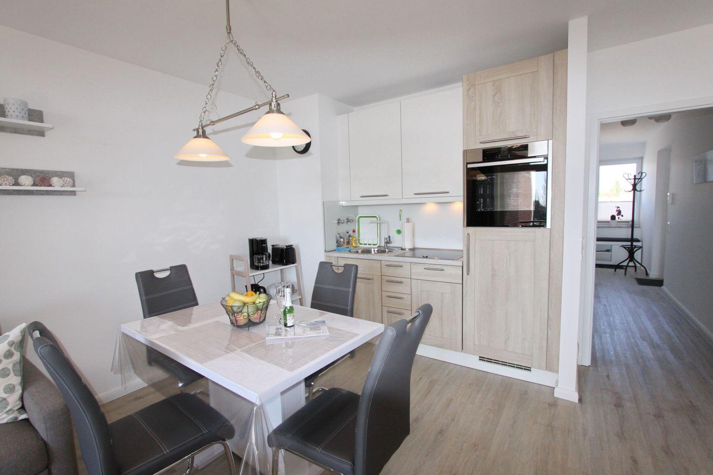 Weiter gelangen Sie in den Wohnraum. Hier finden Sie neben einer Küchenzeile, ausgestattet mit einem Cerankochfeld, Backofen, Geschirrspüler, Kühlschrank mit Gefrierfach, Wasserkocher, Toaster und Kaffeemaschine und den Essbereich für 4 Personen.