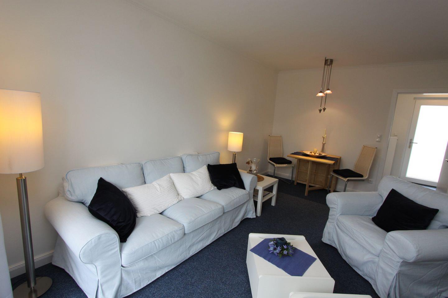 Im Wohnzimmer finden Sie eine gemütliche Couch, einen Sessel, ein Beistelltischchen, ein Flach-TV, eine Stereoanlage und einen Essbereich für 2 Personen.