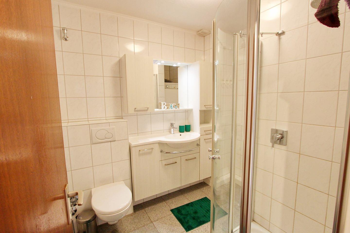 Das schöne, hell geflieste Bad bietet eine große Dusche mit Echtglasabtrennung, einen beleuchteten Spiegel, eine Waschmaschine, sowie einen Föhn.