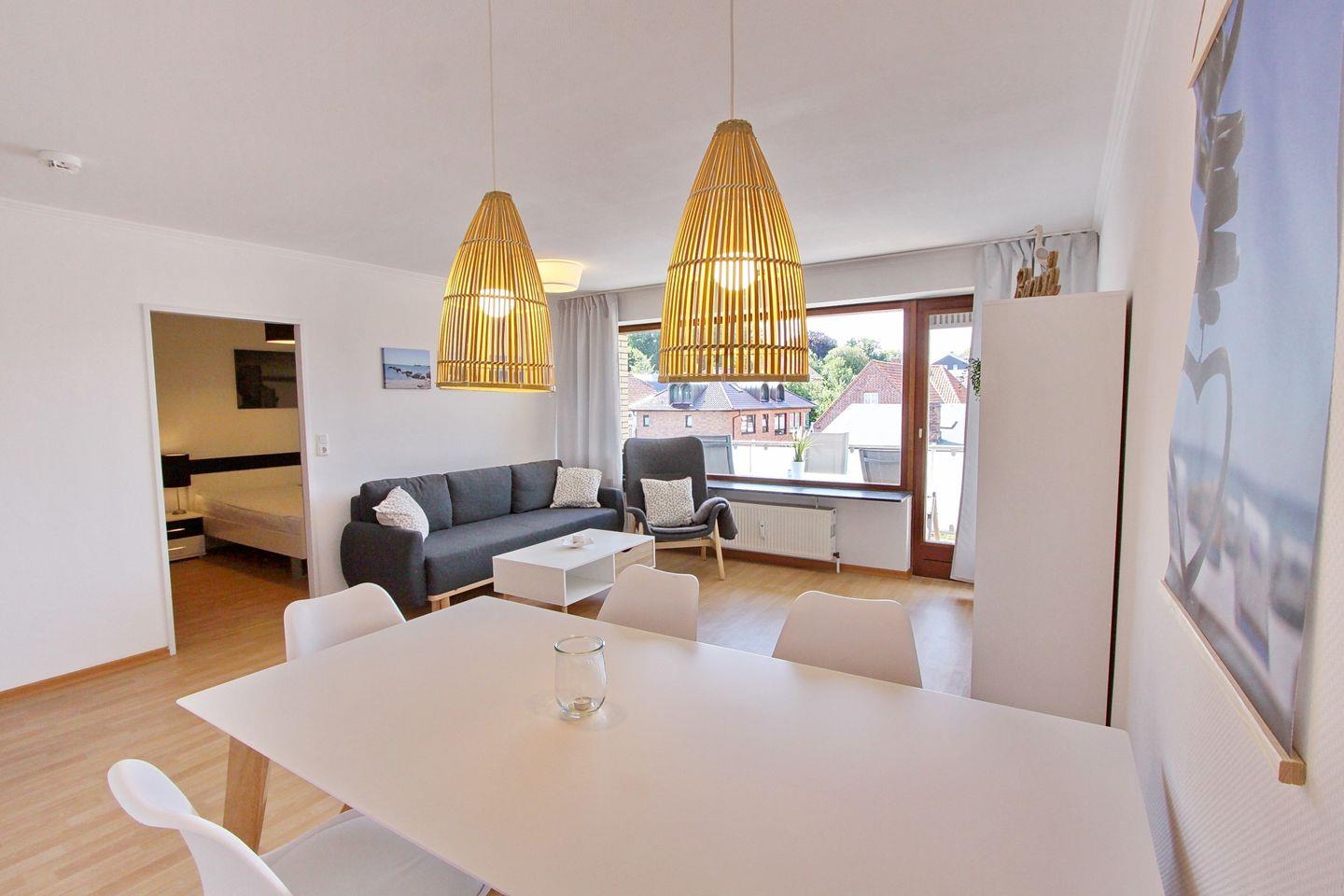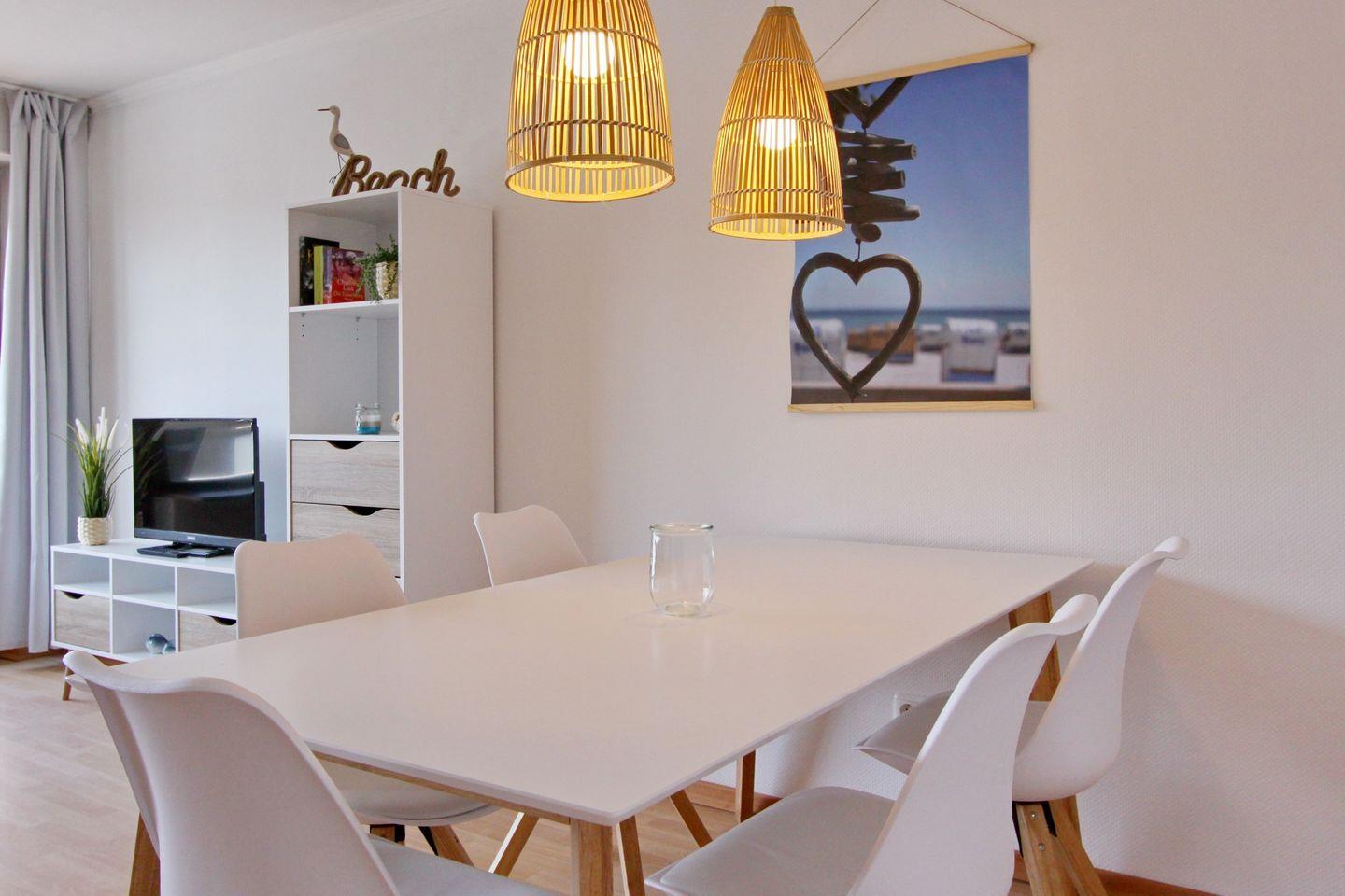 Maritim eingerichtete 3-Zimmer-Ferienwohnung in Grömitz, nur 4 Gehminuten vom Strand entfernt, mit Balkon und WLAN.