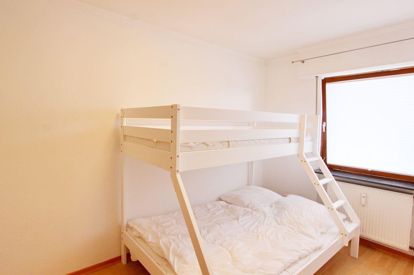 Das hell eingerichtete kleinere Schlafzimmer verfügt über ein Etagenbett für 3 Personen mit einer Liegefläche von 140 x 200 cm sowie 90 x 200 cm und einen eingebauten Kleiderschrank. Außerdem steht Ihnen hier ein zweites TV-Gerät zur Verfügung.