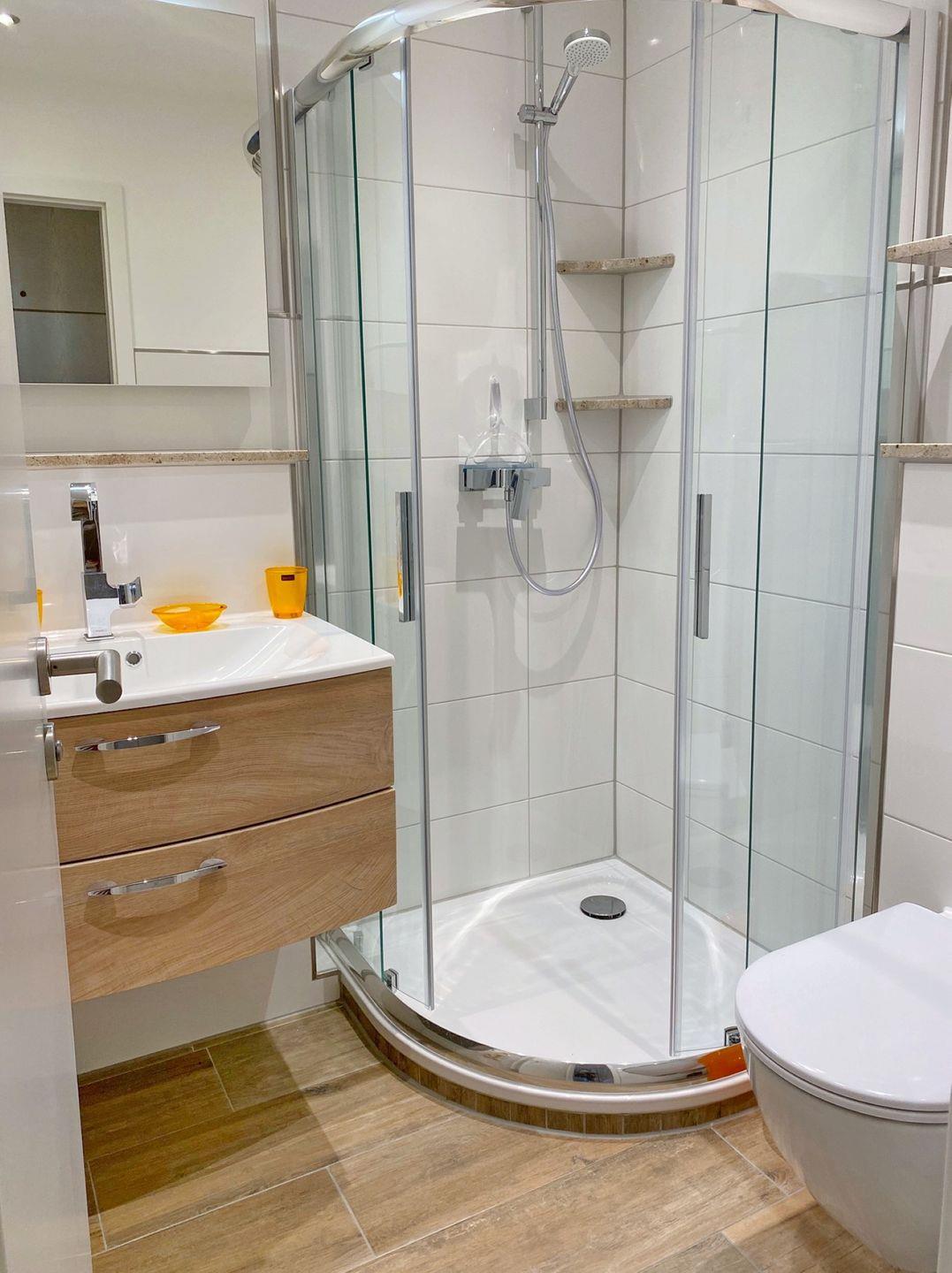 Weiter finden Sie ein modernes Duschbad mit WC und Waschtisch.