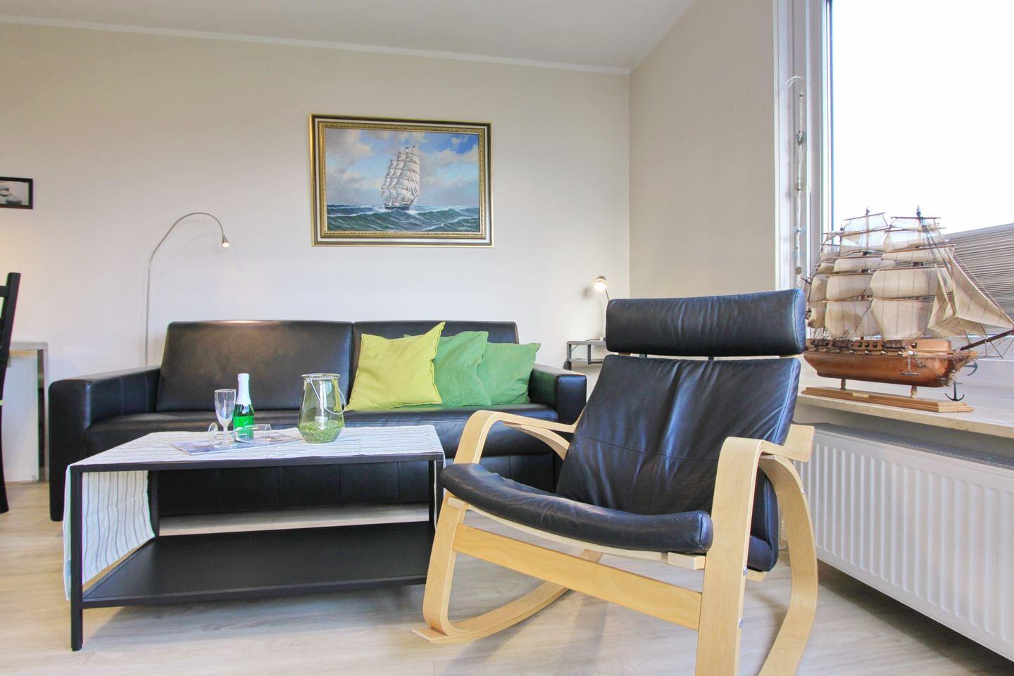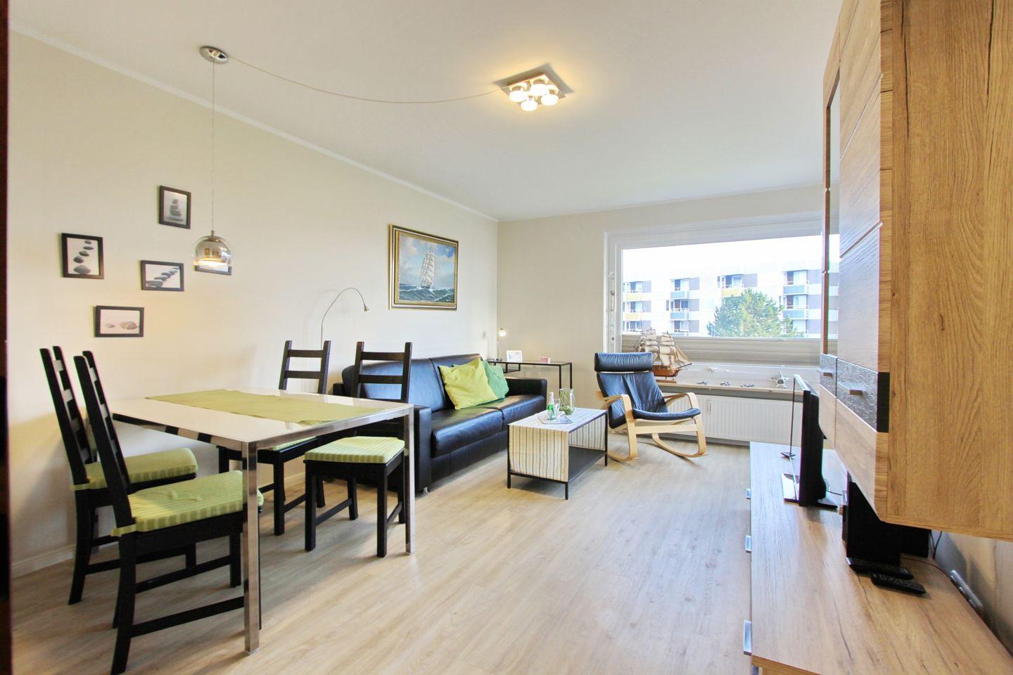 Moderne komfortable Ferienwohnung mit möblierten Balkon in Ostlage und schönem Seeblick, direkt hinter dem Deich, nur wenige Meter zur Promenade.