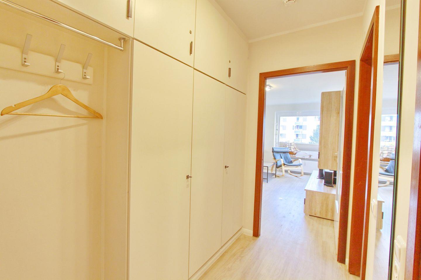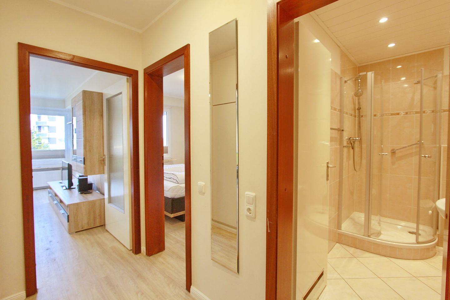 Über einen Flur, welcher Ihnen einen großen Einbauschrank bietet für genügend Stauraum, gelangen Sie in alle Räume der Wohnung.