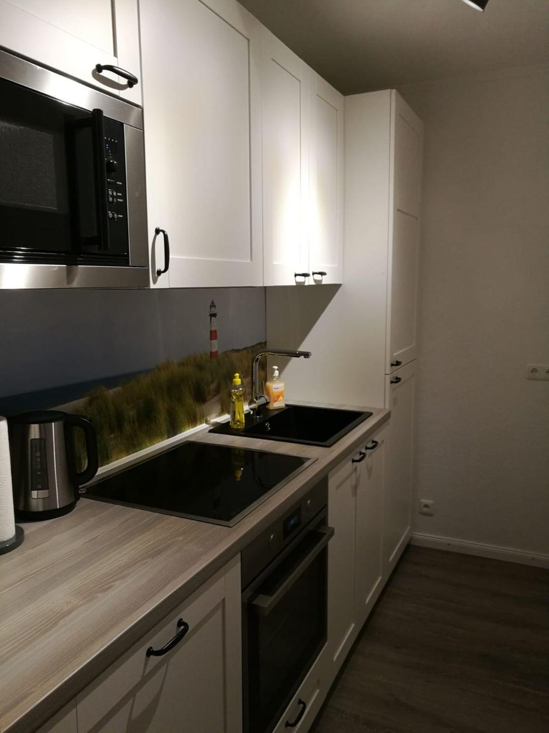 Die in 2019 komplett sanierte, geschmackvoll eingerichtete 2-Zimmer-Wohnung im skandinavischen Stil liegt in der ersten Etage mit Südbalkon mit ansprechender Möblierung mit eingeschränktem Meerblick. Vom Balkon aus können Sie das Meer rauschen hören. Im hellen und modernen Wohnzimmer gibt es eine große Schlafcouch (140 x 200 cm) für 2 Personen, einen Sessel, eine Kommode, einen 55-Zoll-Flatscreen, ein Radio mit USB- und MP3-CD-Player und eine Essecke mit 4 Stühlen. Der lichtdurchflutete Raum lädt zum relaxen und entspannen ein. Hier können Sie den Urlaubstag mit einem leckeren Frühstück beginnen. Planen Sie in dieser gemütlichen Atmosphäre die Aktivitäten für den nächsten Tag und lassen Sie den Urlaubstag entspannt ausklingen. Die separate Küche ist ausgestattet mit einem Induktionskochfeld und einer Dunstabzugshaube, einem Backofen, einem großen Kühlschrank mit Gefrierfach, einem Geschirrspüler, einer Mikrowelle, einer Kaffeemaschine, einem Wasserkocher und einem Toaster.