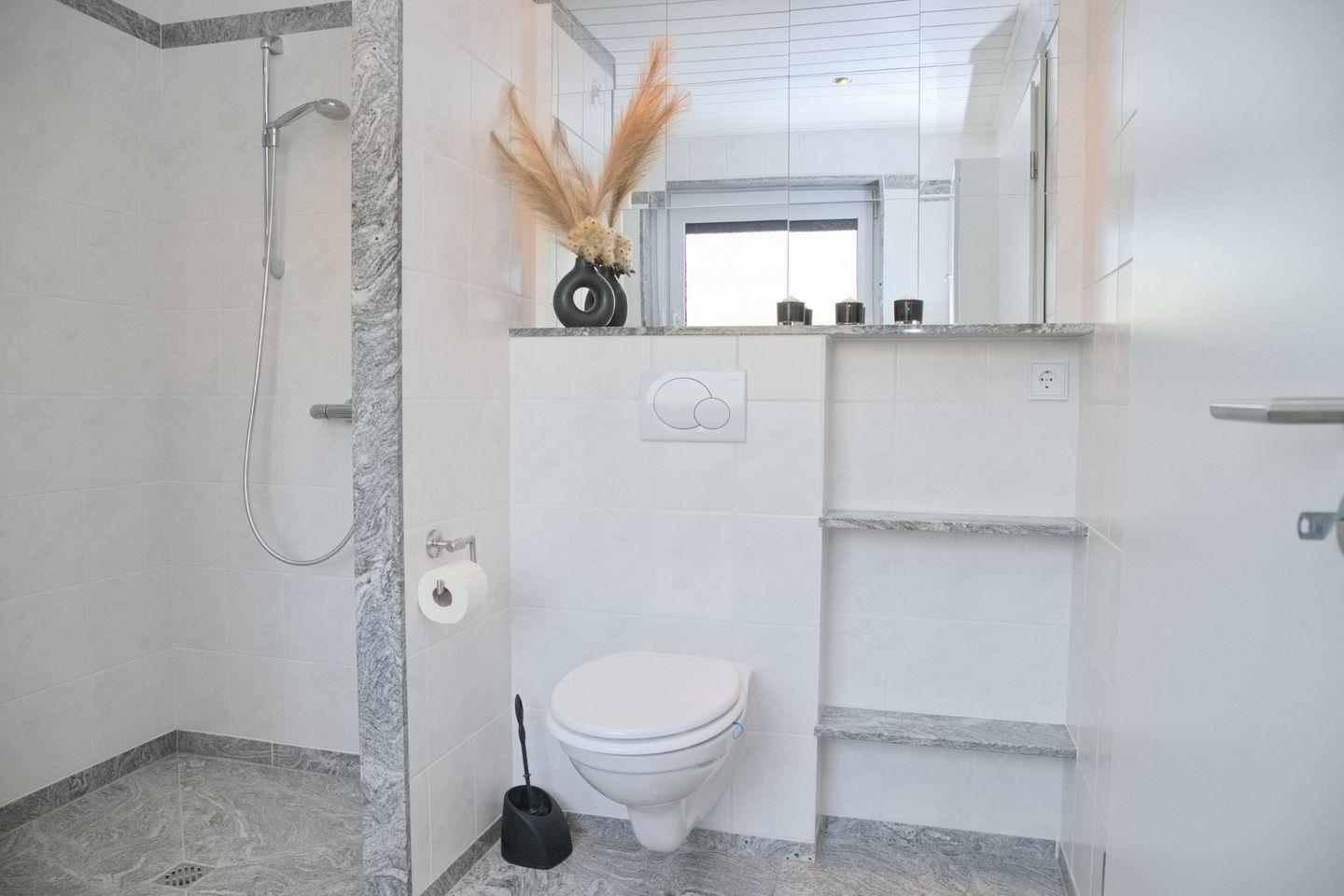 Das moderne Badezimmer überzeugt mit einer ebenerdigen Dusche, einem WC, einem Waschbecken sowie einem großen Spiegel. Praktischer Stauraum wird durch einen Hängeschrank und ein Ablageregal geboten. Der Handtuchheizkörper sorgt stets für angenehm warme Handtücher und die Fußbodenheizung für ein wohliges Gefühl, wenn Sie aus der Dusche kommen.