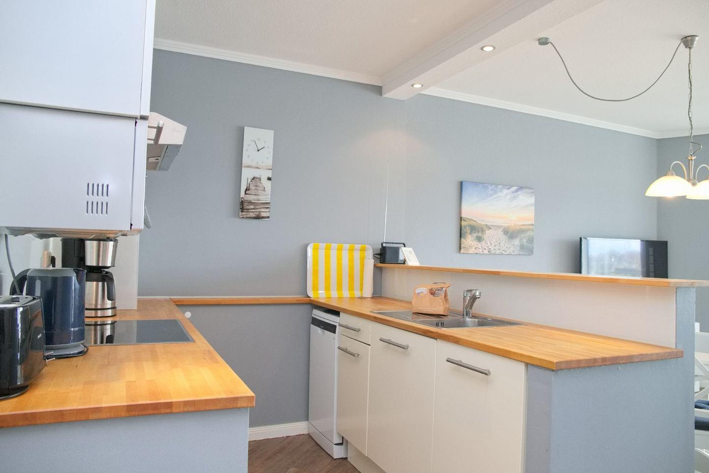 Die moderne Küche ist voll ausgestattet und bietet alles, was Sie benötigen, um köstliche Mahlzeiten zuzubereiten, darunter ein Ceranfeld, Backofen, Geschirrspüler, Mikrowelle, Kühlschrank mit Gefrierfach, Toaster, Kaffeemaschine und Wasserkocher.