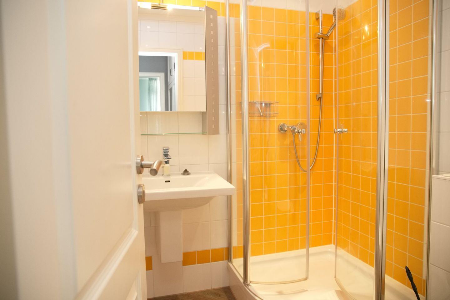 Das Badezimmer ist modern und funktional gestaltet und bietet eine Dusche, WC, Waschbecken, einen Handtuchheizkörper und einen Spiegelschrank für Ihre Bequemlichkeit.