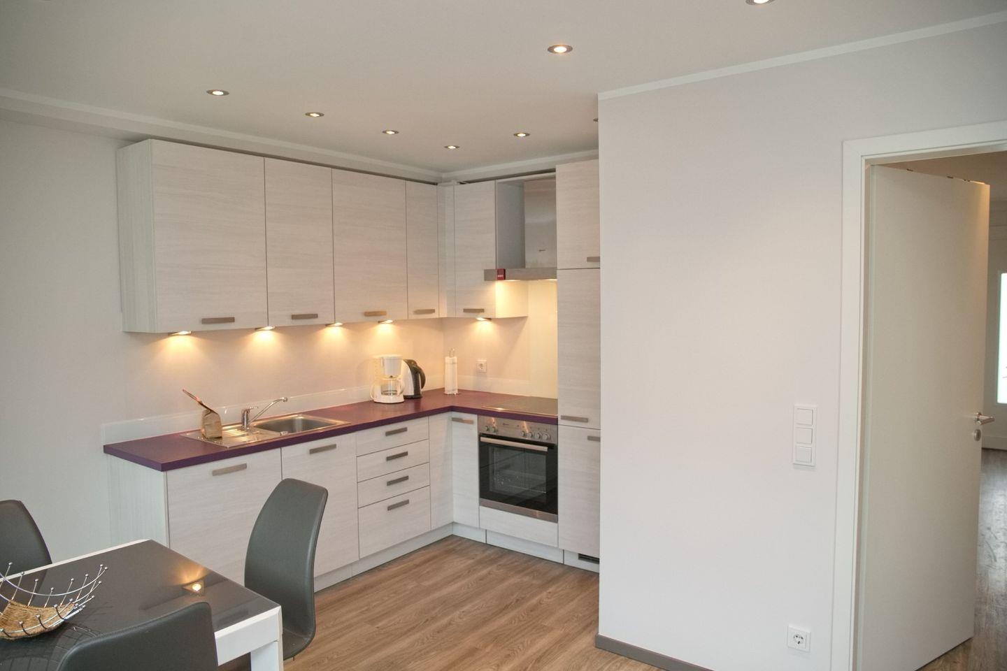 Ein praktisches Etagenbett und eine Kommode finden Sie im Kinderzimmer. Im Badezimmer ist eine ebenerdige Dusche, ein WC, Waschbecken mit Unterschrank und eine Handtuchheizung mit getrennt regelbarer Fußbodenheizung. Die gesamte Ferienwohnung ist mit Designerplanken und dimmbaren Deckenspots ausgestattet.