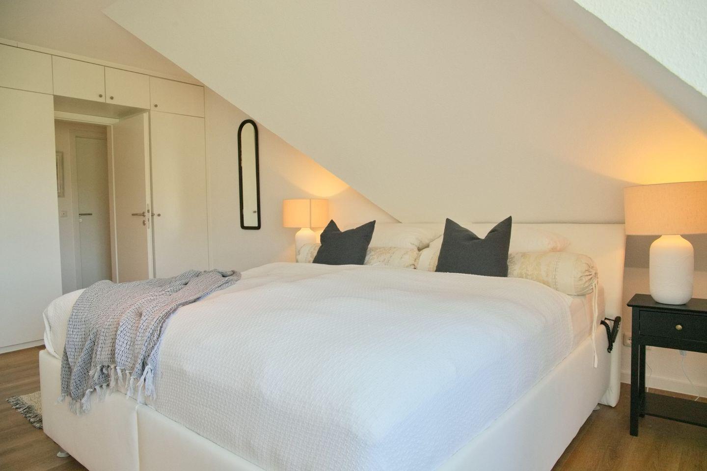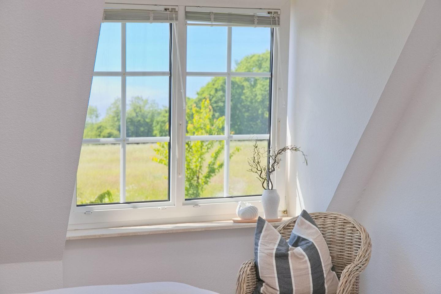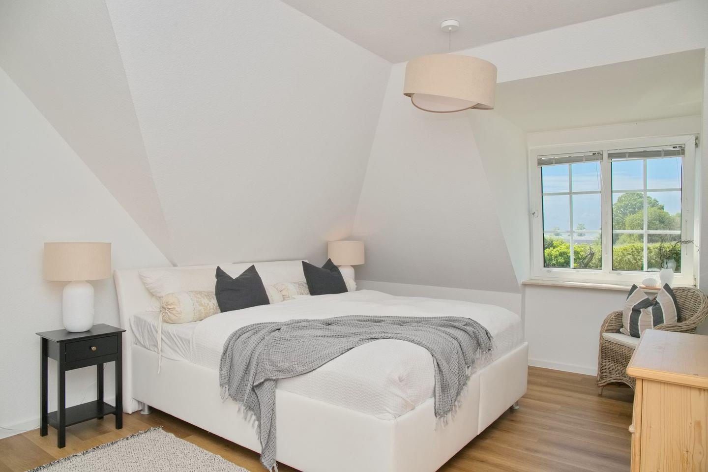 Das Hauptschlafzimmer ist mit einem großzügigen Einbauschrank ausgestattet, der viel Stauraum bietet. Das Doppelbett ermöglicht einen erholsamen Schlaf, während das Fenster einen Ausblick auf die umliegenden Felder und schrägen Meerblick gewährt.