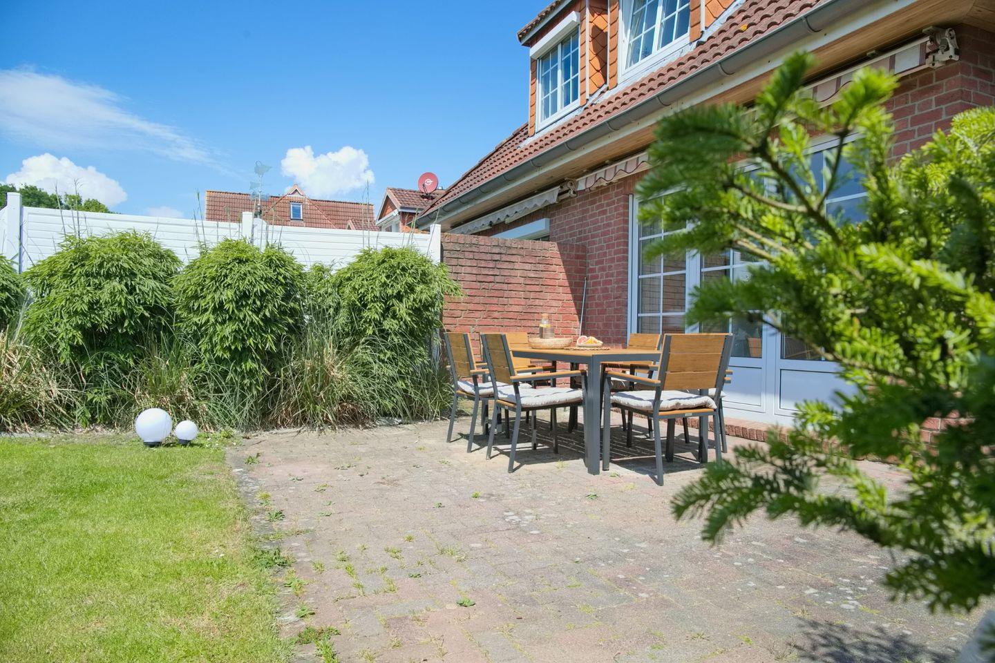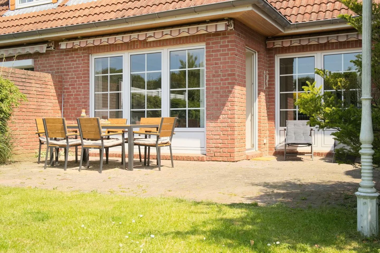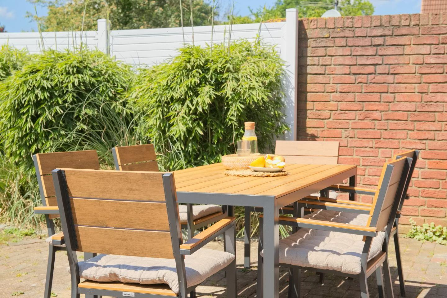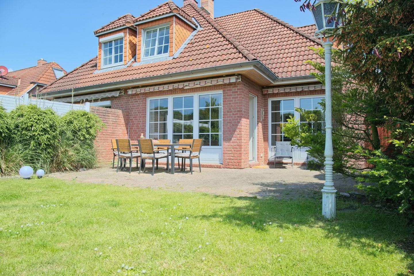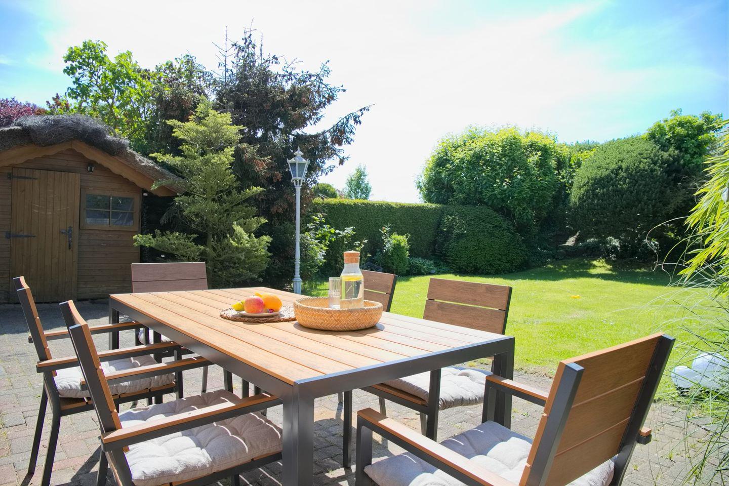 Der schön angelegte Garten mit Südwest-Ausrichtung ist eingezäunt und bietet Zugang zu den angrenzenden Feldern durch ein kleines Gartentor. Die Terrasse ist mit einem Esstisch für 6 Personen und zwei Liegestühlen möbliert, während Markisen für angenehmen Schatten sorgen.