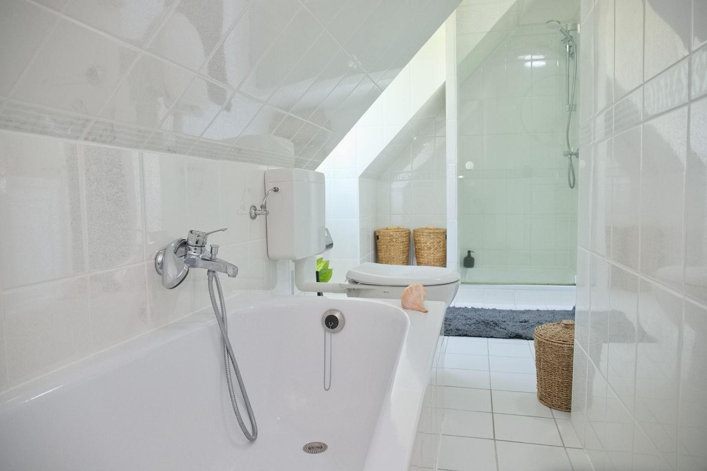 Das Hauptbad im ersten Obergeschoss zeichnet sich durch ein großes Fenster aus, das einen herrlichen Blick auf den gegenüberliegenden Teich bietet. Hier stehen eine Dusche und eine Badewanne für entspannende Stunden zur Verfügung.