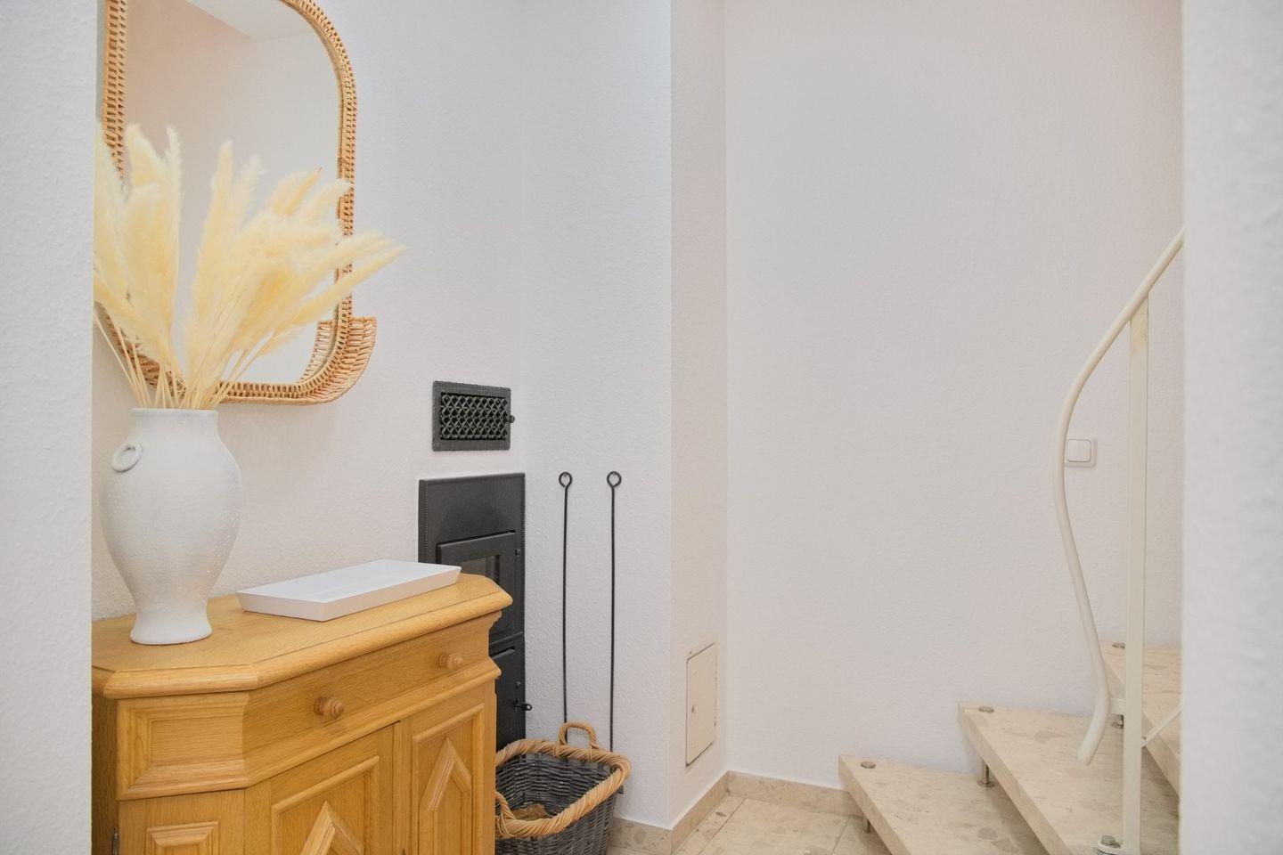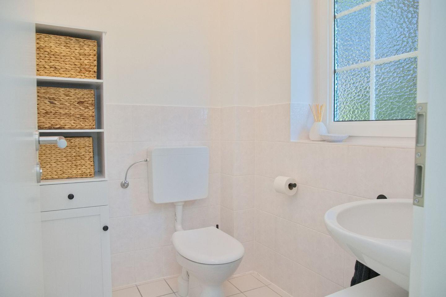 Im Erdgeschoss befindet sich ein geräumiges Gäste-WC mit einem großen Fenster, das für Tageslicht und Frische sorgt. Der Windfang verfügt über einen Einbauschrank mit ausreichend Stauraum für Jacken und Schuhe.