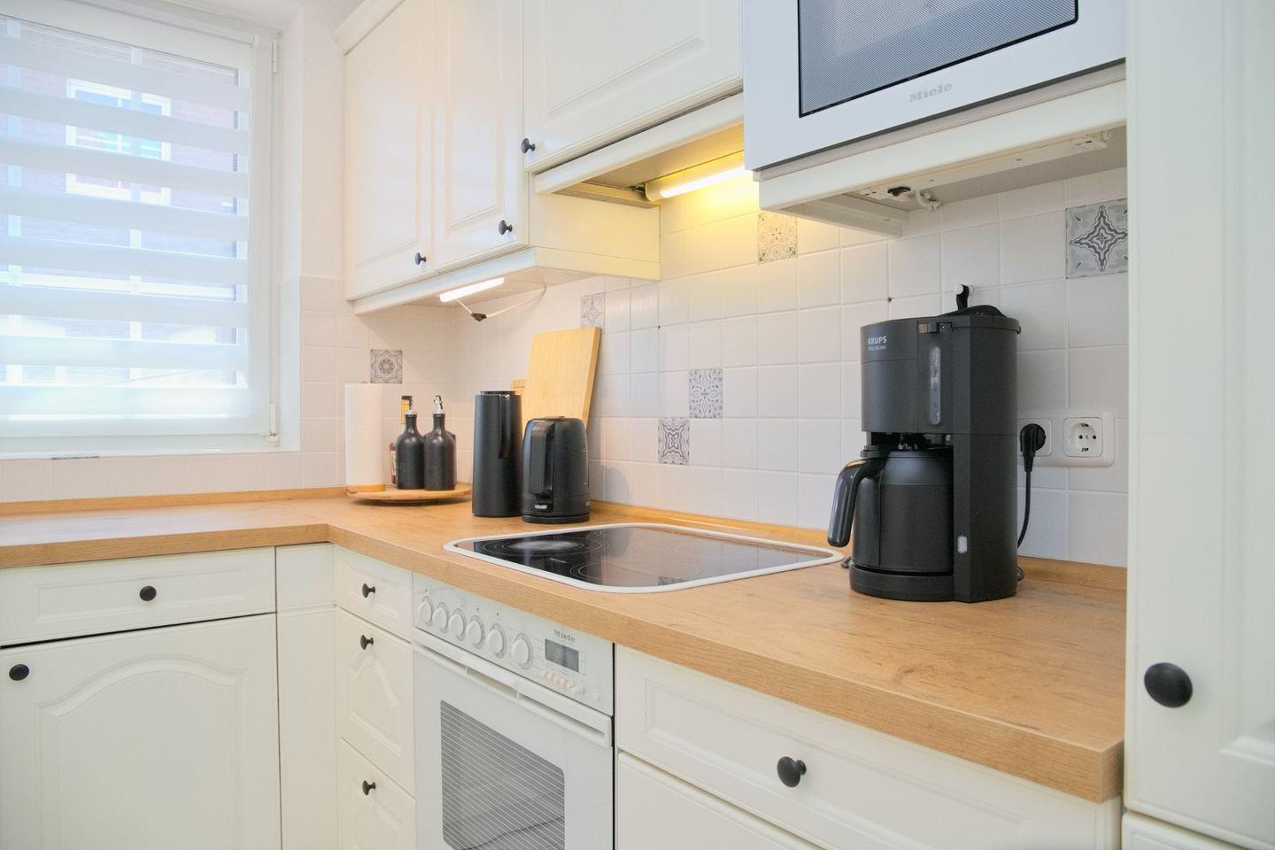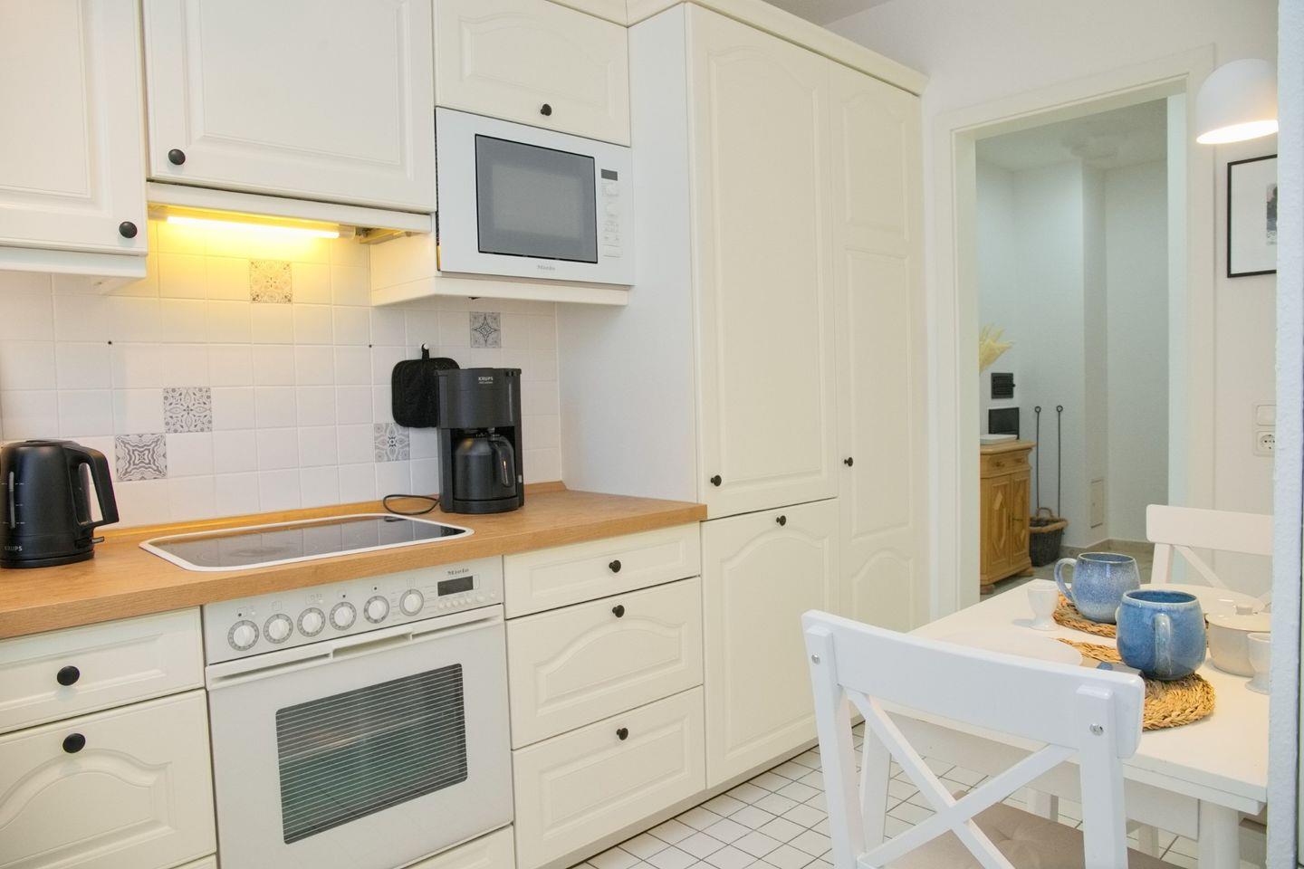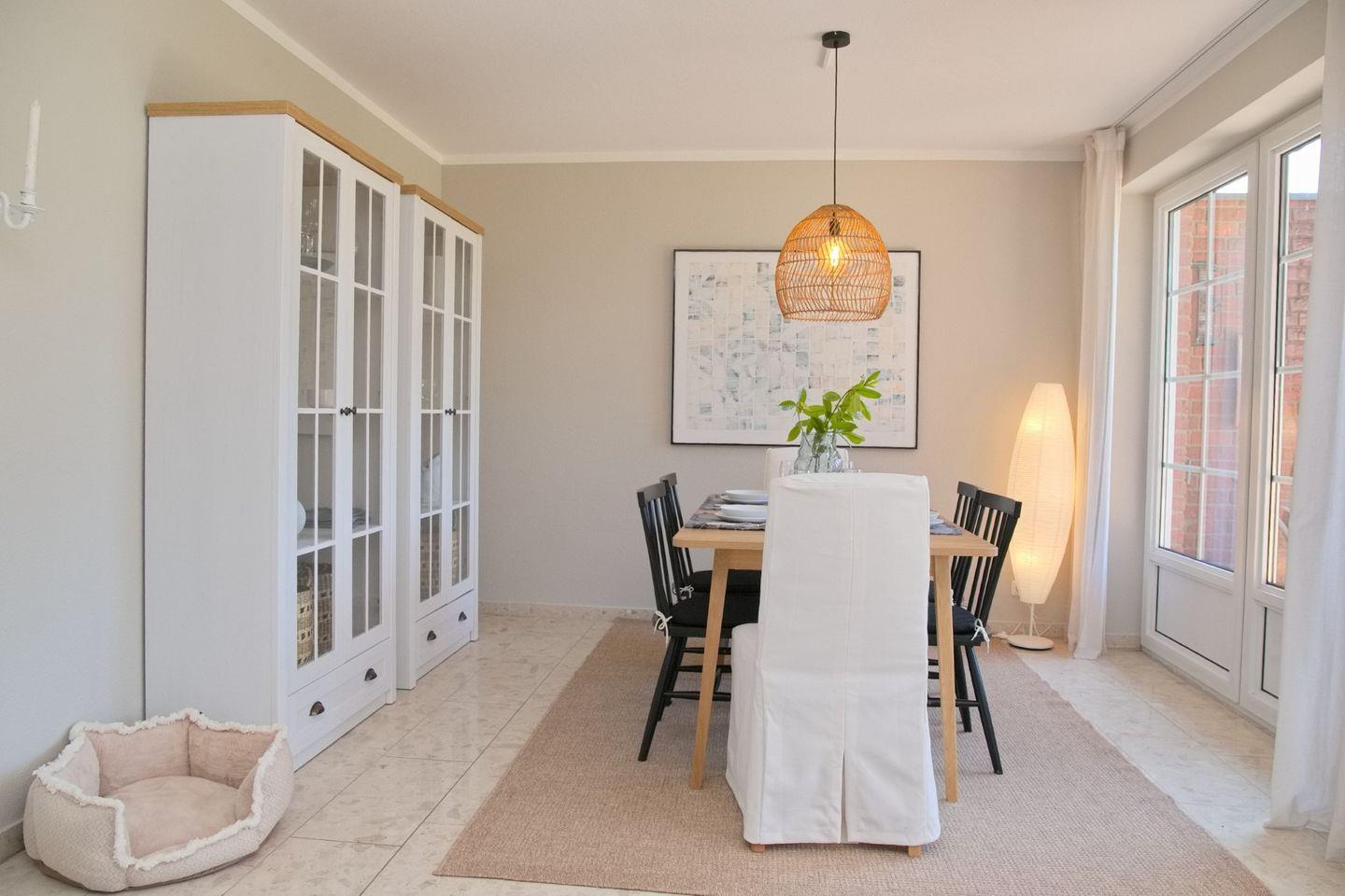 Die lichtdurchfluteten Räume bieten eine einladende Atmosphäre, besonders im Wohn- Essbereich mit Platz für 4 Erwachsenen Personen plus Kleinkind. Die separate Landhausküche beeindruckt mit weißem Design und einem gemütlichen Essplatz für zwei.