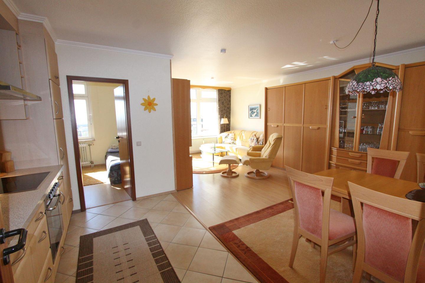 Zu Ihrer linken ist die voll ausgestattete Küchenzeile mit Ceranfeld, Kühlschrank mit Gefrierfach, Spülmaschine, Backofen, Wasserkocher, Kaffeemaschine und Toaster. Auf der Rechten finden Sie den Essbereich mit 4 Sitzmöglichkeiten.