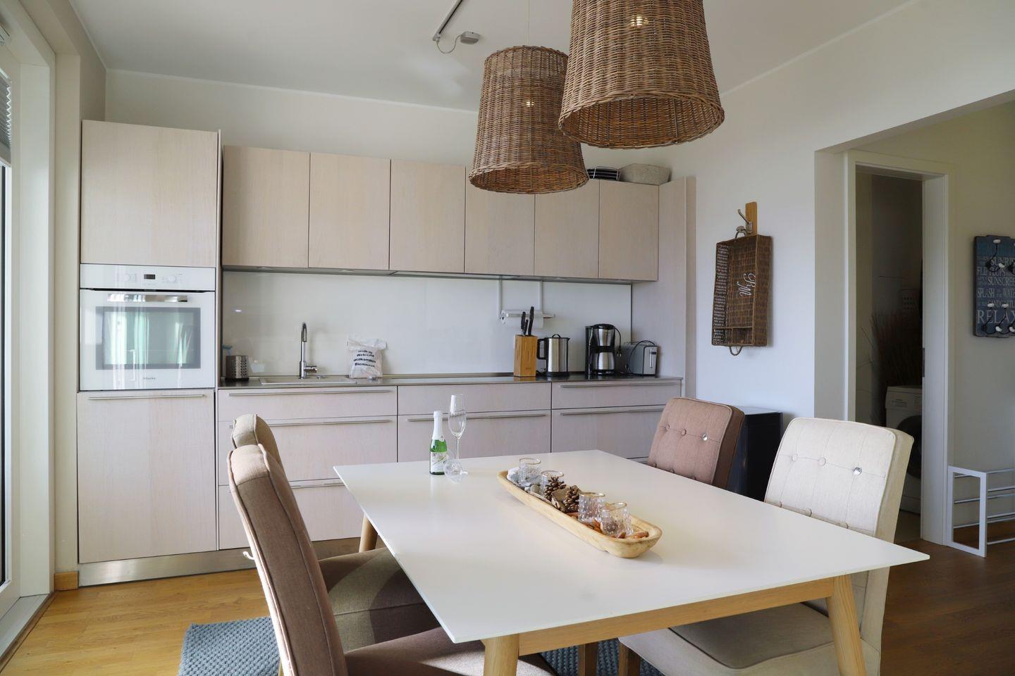Die offene hochwertige Einbauküche ist gut ausgestattet mit einem Induktionskochfeld, einem Backofen in Komfort höhe, einer Geschirrspülmaschine, einem Toaster, einer Kaffeemaschine, einer Nespresso Maschine, Mikrowelle, einem Wasserkocher und einer Kühl- Gefrierkombi.