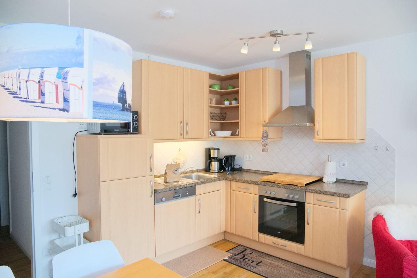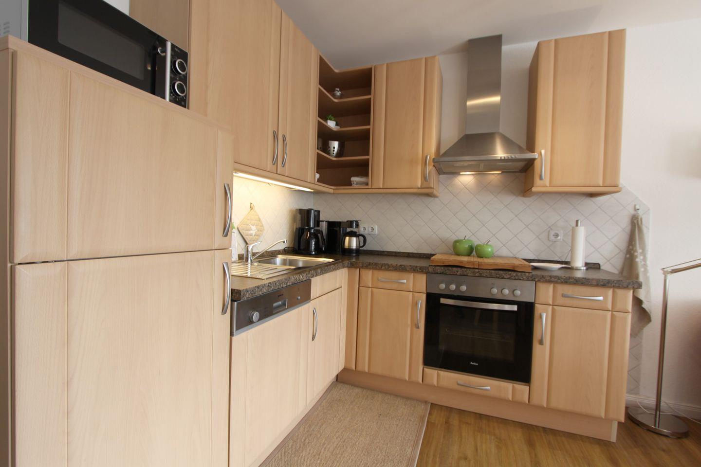 Neben einer voll ausgestatteten Einbauküche, mit Cerankochfeld, Backofen, Dunstabzugshaube, Mikrowelle, Geschirrspüler, Kühlschrank, Gefrierfach, Wasserkocher, Toaster, Pad Maschine und Kaffeemaschine, finden Sie einen Essbereich für die ganze Familie. Das Highlight hier ist die individuell gestaltete Pendelleuchte über dem Esstisch mit "Grömitz" Motiven.