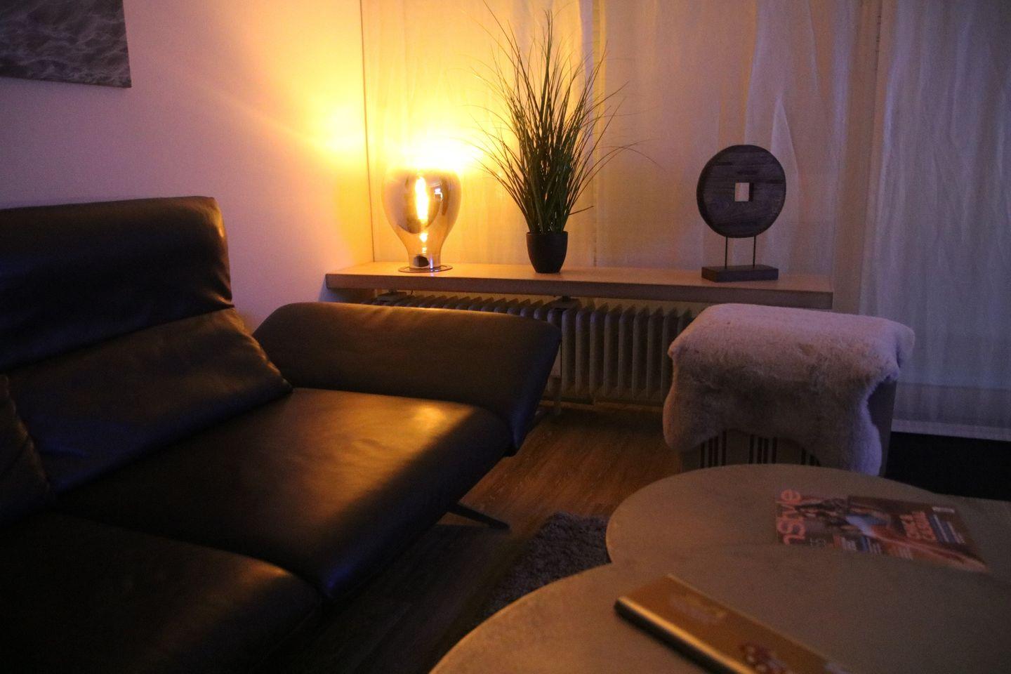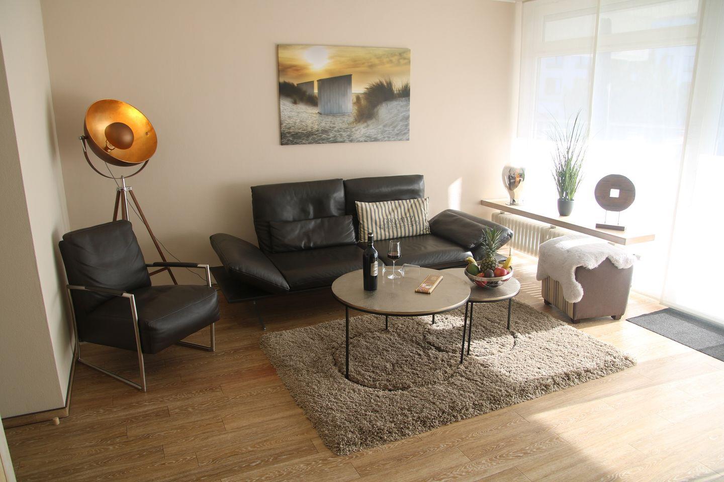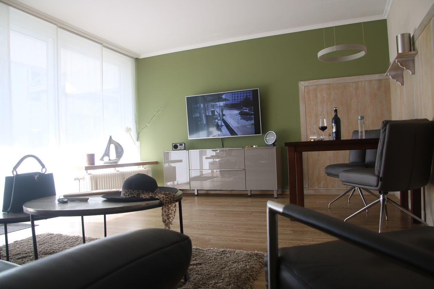 Das Wohnzimmer ist mit einer eleganten 3er Ledercouch, einem passenden Sessel und einem Hocker ausgestattet und bietet somit eine komfortable Sitzgelegenheit. Ein Flachbildfernseher sorgt für entspannte Abende. Vom Wohnzimmer aus haben Sie direkten Zugang zum Balkon, der zum Verweilen und Entspannen einlädt.