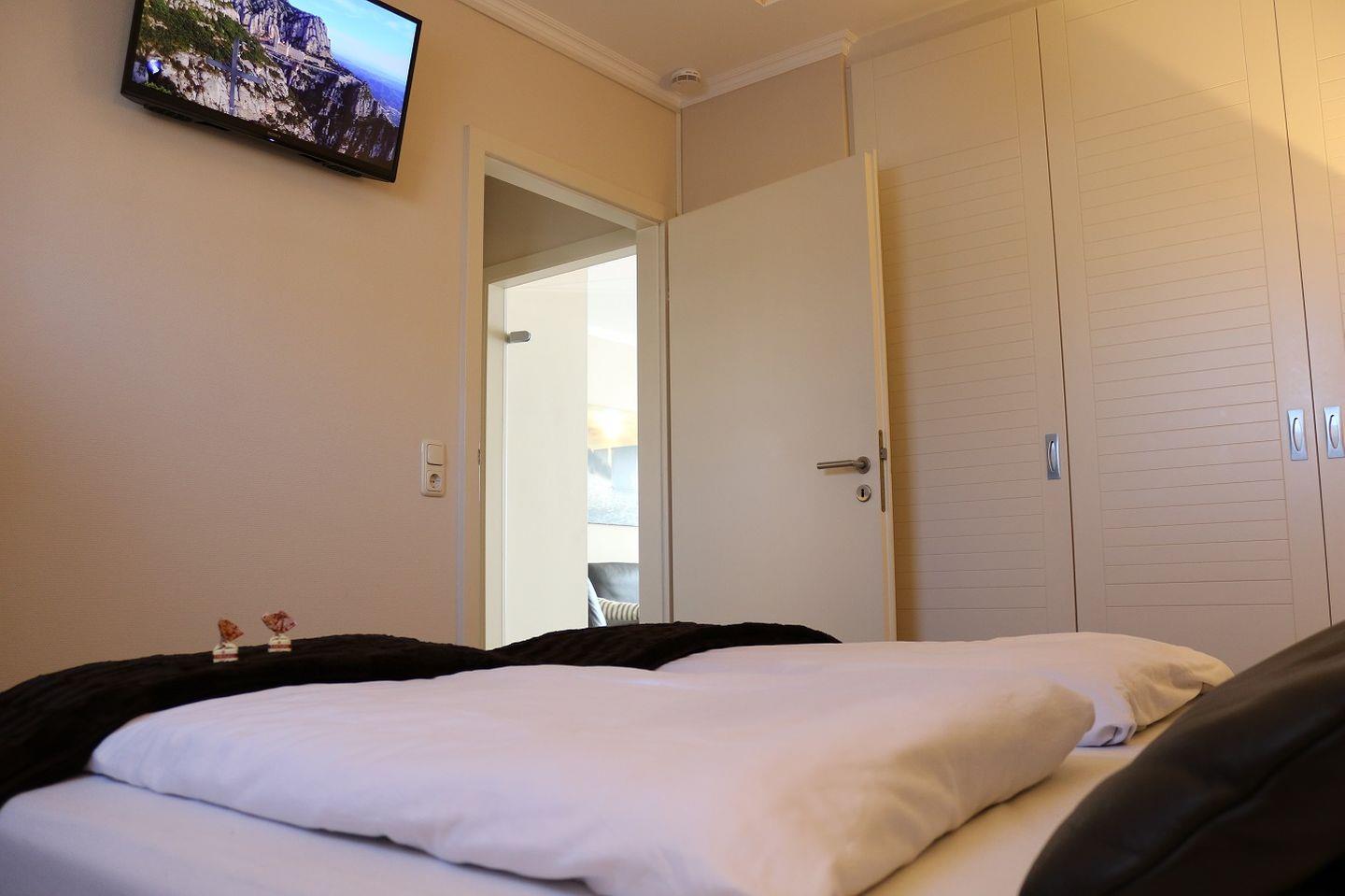 Das Schlafzimmer ist mit einem komfortablen Doppelbett (zwei Matratzen à 90x200 cm) ausgestattet und bietet zudem einen großen Kleiderschrank für ausreichend Stauraum. Ein weiterer Flachbildfernseher im Schlafzimmer sorgt für zusätzlichen Komfort.