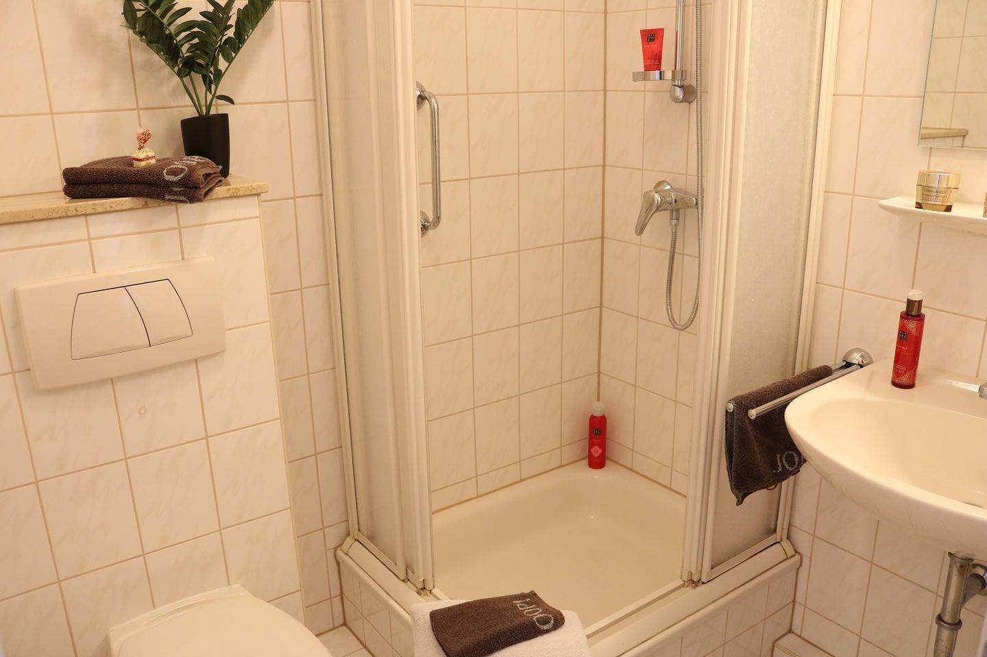 Das innenliegende Badezimmer verfügt über eine Dusche mit hohem Einstieg, ein Waschbecken und ein WC. Hier finden Sie alles, was Sie für Ihre tägliche Pflege benötigen.