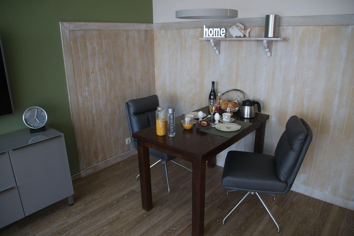 Der Essbereich ist für zwei Personen ausgelegt und bietet einen gemütlichen Platz für gemeinsame Mahlzeiten. In der separaten Küche finden Sie alles, was Sie für die Zubereitung Ihrer Speisen benötigen: ein Ceranfeld ohne Backofen, eine Dunstabzugshaube, einen Kühlschrank mit Gefrierfach, eine Kaffeemaschine, einen Wasserkocher, einen Toaster und eine Mikrowelle.