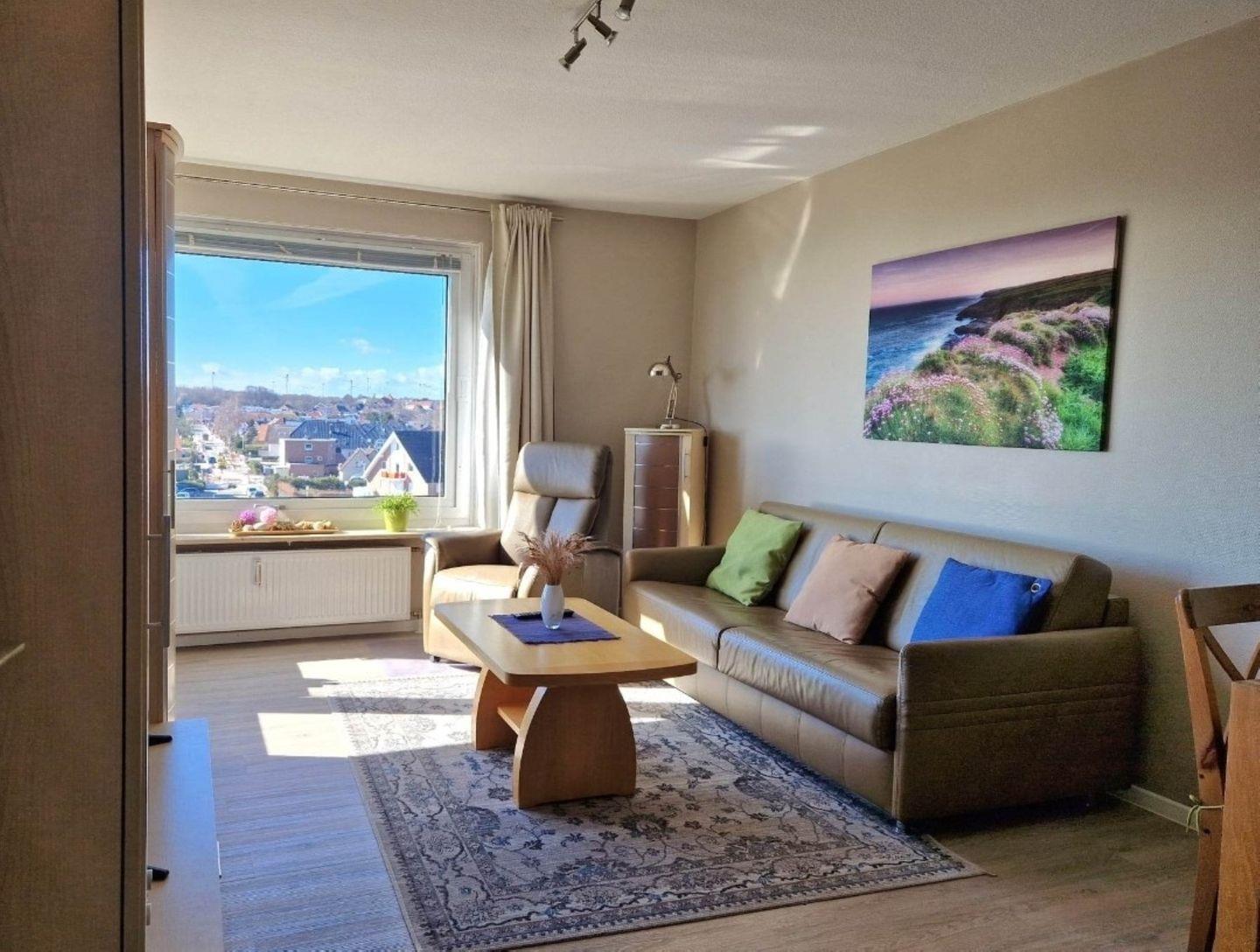 Die Wohnung befindet sich im Haus "Hanseat I" direkt am Meer. Beim Betreten der Wohnung gelangt man in einen geräumigen Flur, von dem aus man Zugang zu den verschiedenen Zimmern hat. Das Wohnzimmer ist lichtdurchflutet und bietet dank der großen Fensterfront einen atemberaubenden Blick auf das Meer. Hier gibt es genügend Platz für einen bequemen Wohnbereich mit Schlafcouch ( 160x200 )sowie einen Esstisch für gemütliche Mahlzeiten mit Blick auf das Wasser.