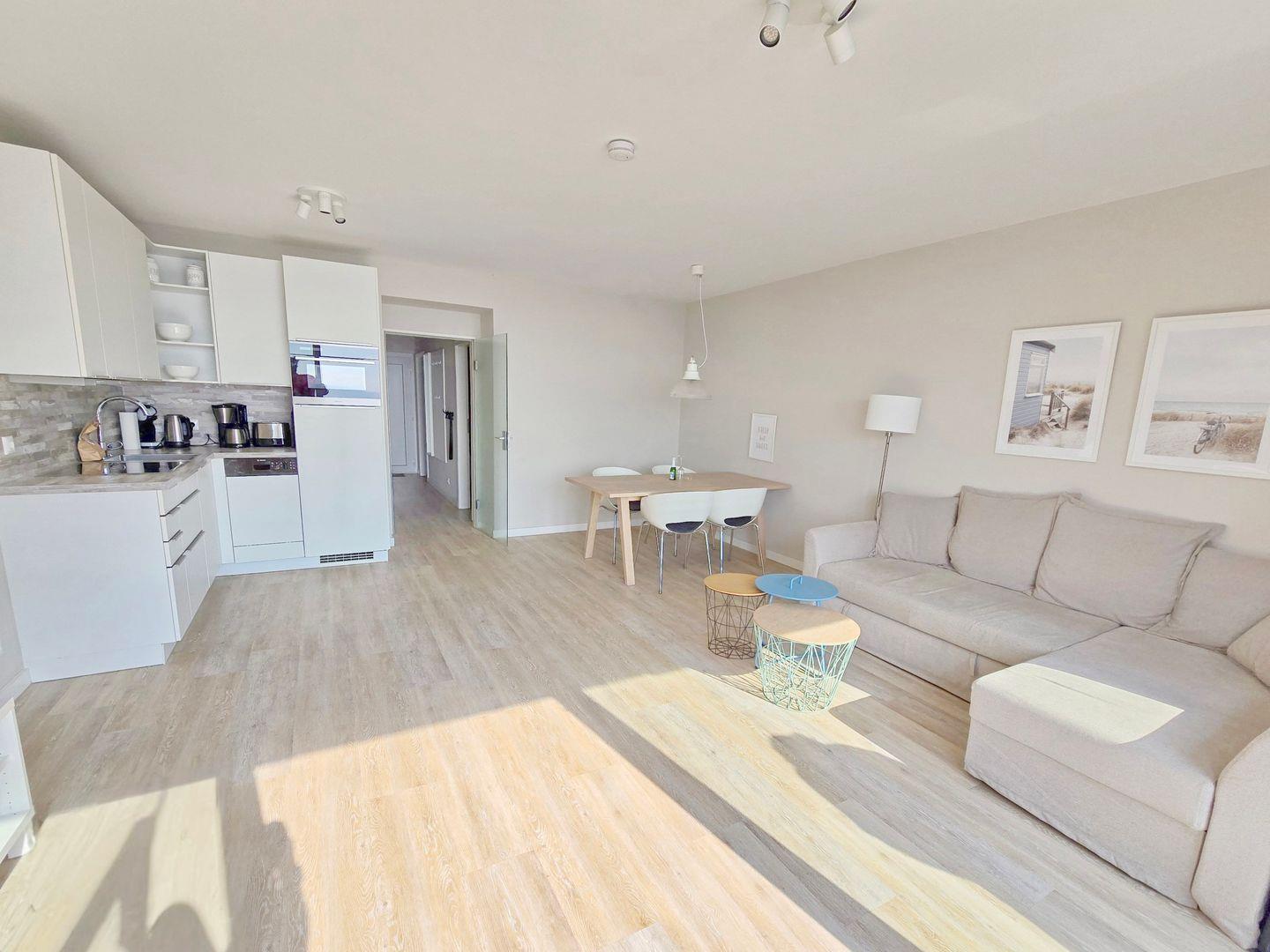 Das große Wohnzimmer mit offener Küche hat einen herrlichen Panoramablick auf die Ostsee. Die Essecke bietet 4 Personen Platz. Eine komfortable Leder-Wohnlandschaft lädt zum Entspannen vor dem 49“-LCD-SmartTV ein. Ein Digitalradio mit Bluetooth-Streamingfunktion finden Sie hier ebenfalls.