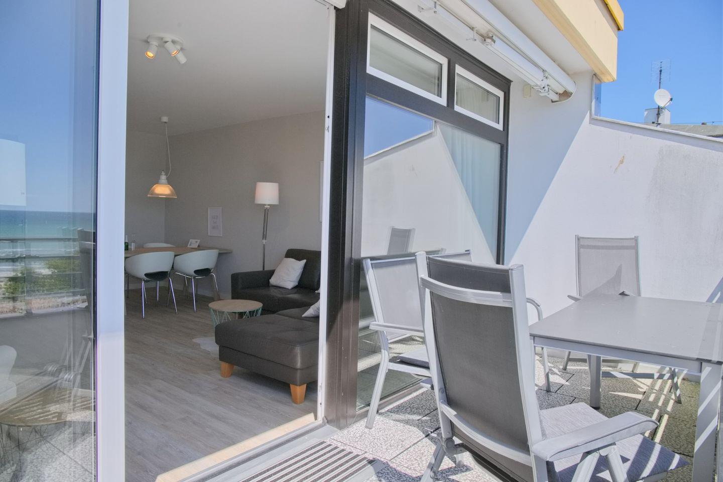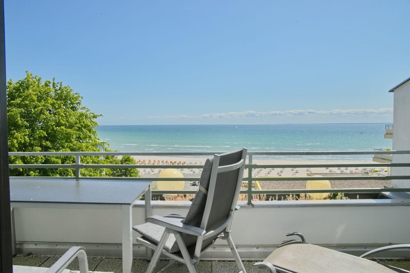 Der windgeschützte, große Balkon ist mit einem Tisch, zwei Hochlehnern, einer Bank, einer Liege, sowie einer elektrischen Markise ausgestattet. Der wunderbare Meerblick lädt zum Verweilen und Entspannen ein.