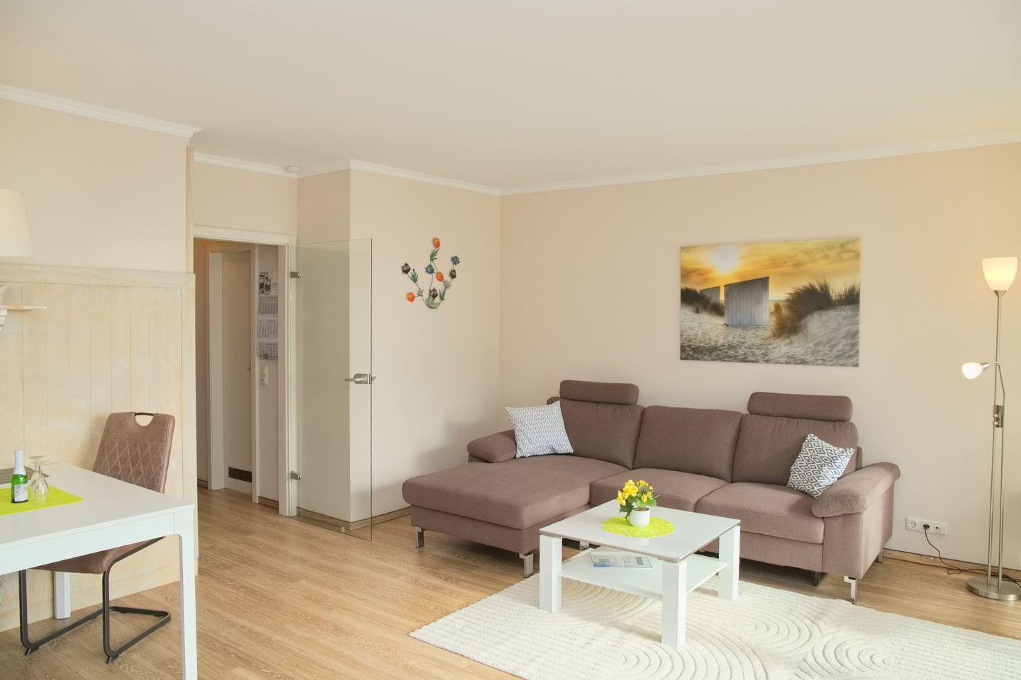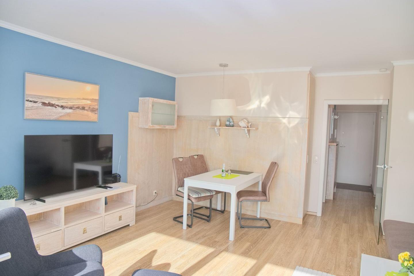 Mit einer großzügigen Fläche von 50 m² besticht die Wohnung durch ihre durchdachte Raumaufteilung und geschmackvolle Einrichtung. Der einladende Wohnbereich lädt zum Entspannen ein und verfügt über ein gemütliches Sofa sowie einen Sessel, wo Sie nach einem erlebnisreichen Tag die Seele baumeln lassen können. Ein TV sorgt dafür, dass Sie auch am Abend nicht auf Ihre Lieblingssendungen verzichten müssen.