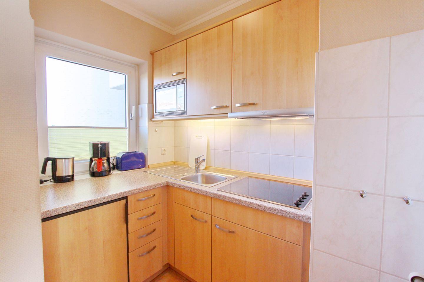 Die geschlossene Küche ist perfekt ausgestattet mit einem Ceranherd, Kühlschrank, Mikrowelle und einer praktischen Kaffeemaschine – ideal für die Zubereitung von Mahlzeiten während Ihres Aufenthalts. Hier finden Sie auch einen Esstisch, an dem Sie Ihre kulinarischen Kreationen gemeinsam genießen können. Das Badezimmer ist mit einer Dusche ausgestattet und verfügt über alles Notwendige wie Waschbecken und WC.