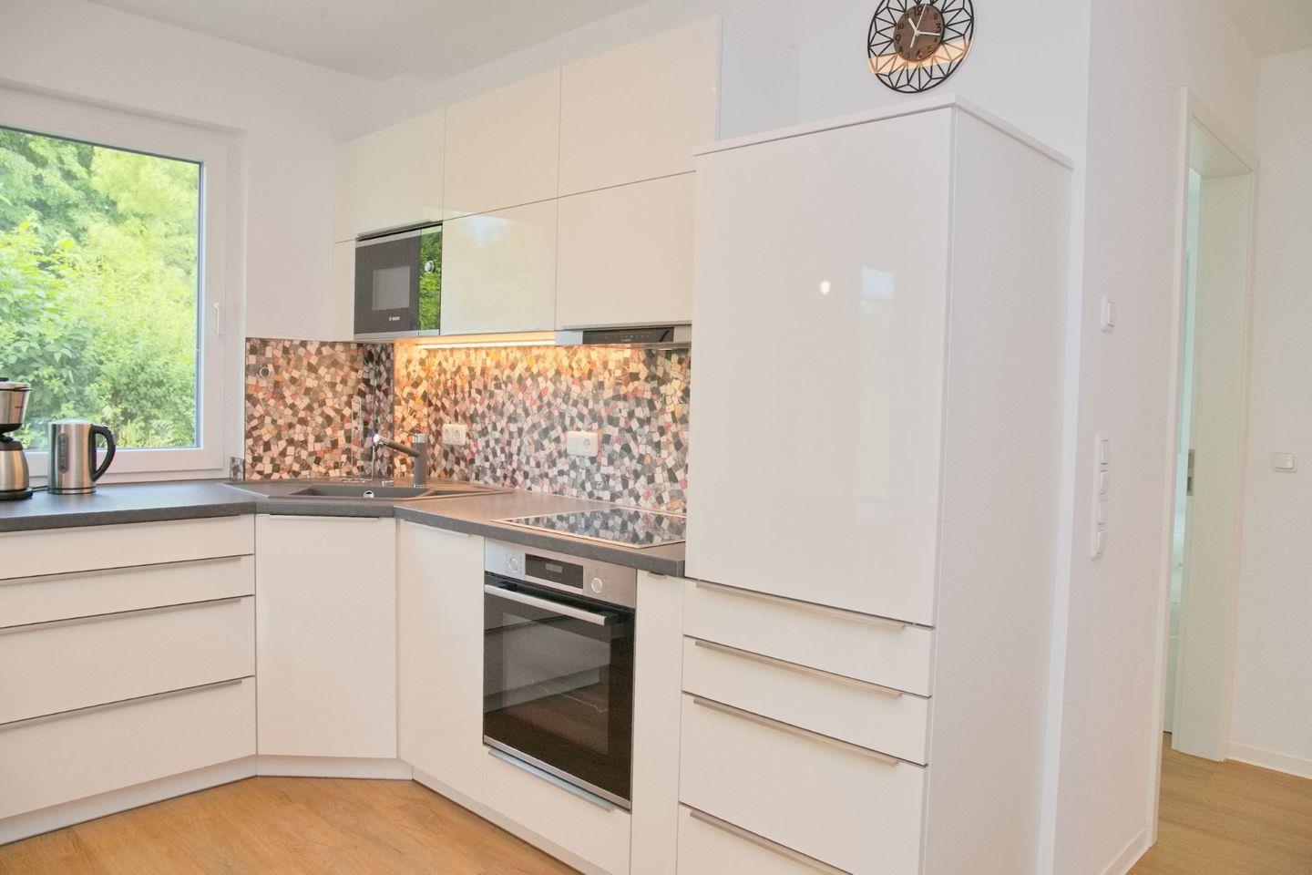 Ihre moderne Design-Küche im edlen Weiß verwöhnt Sie mit Cerankochfeld, Mikrowelle, Backofen, Geschirrspüler sowie einer Kaffeemaschine, Wasserkocher und Toaster. Ihr Bad bietet Ihnen eine ebenerdige Dusche, WC und Waschtisch. Ein beheizter Handtuchhalter versteht sich von selbst.