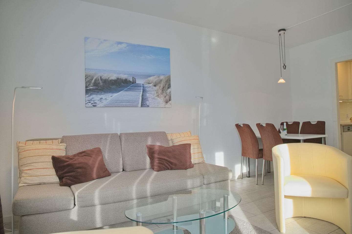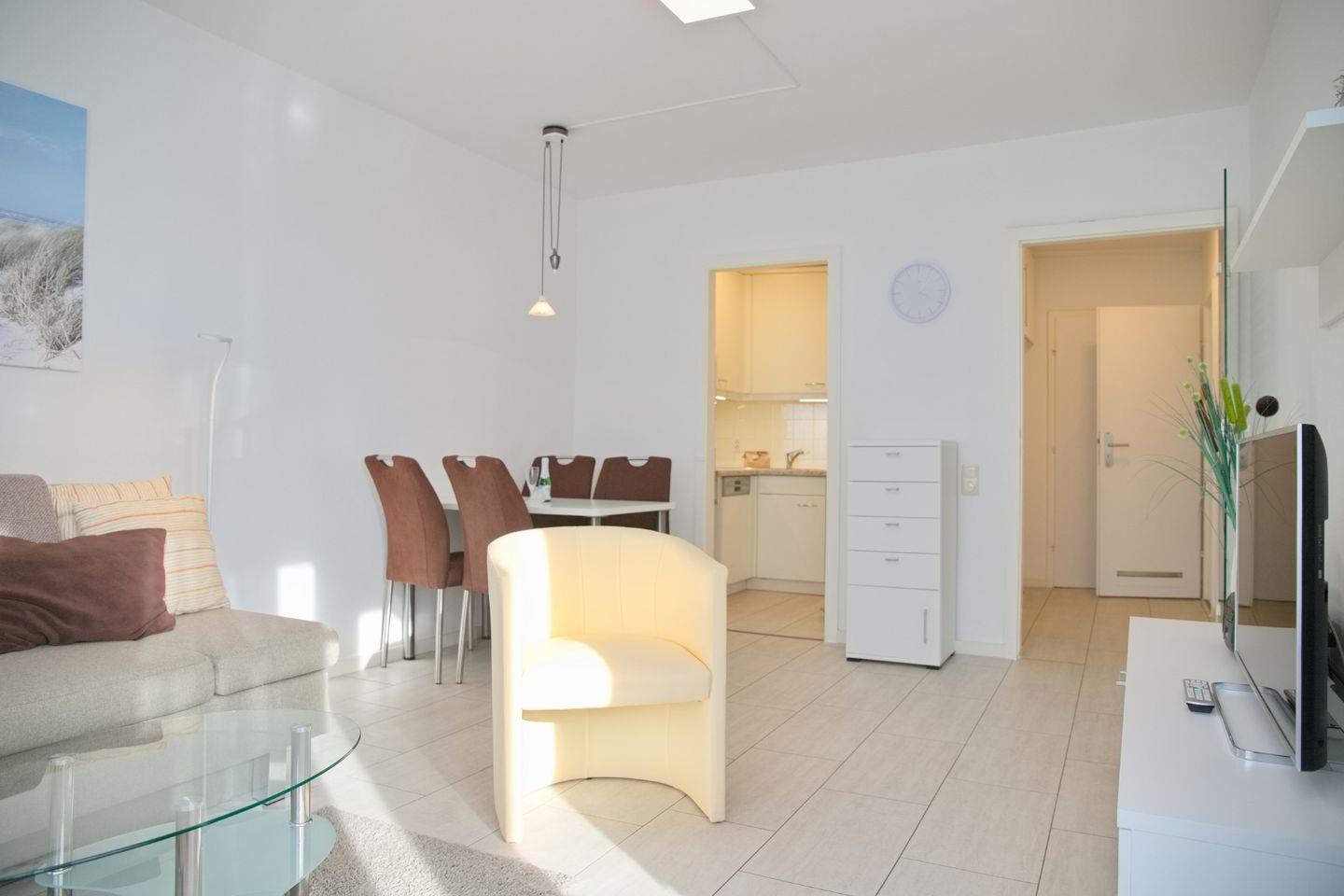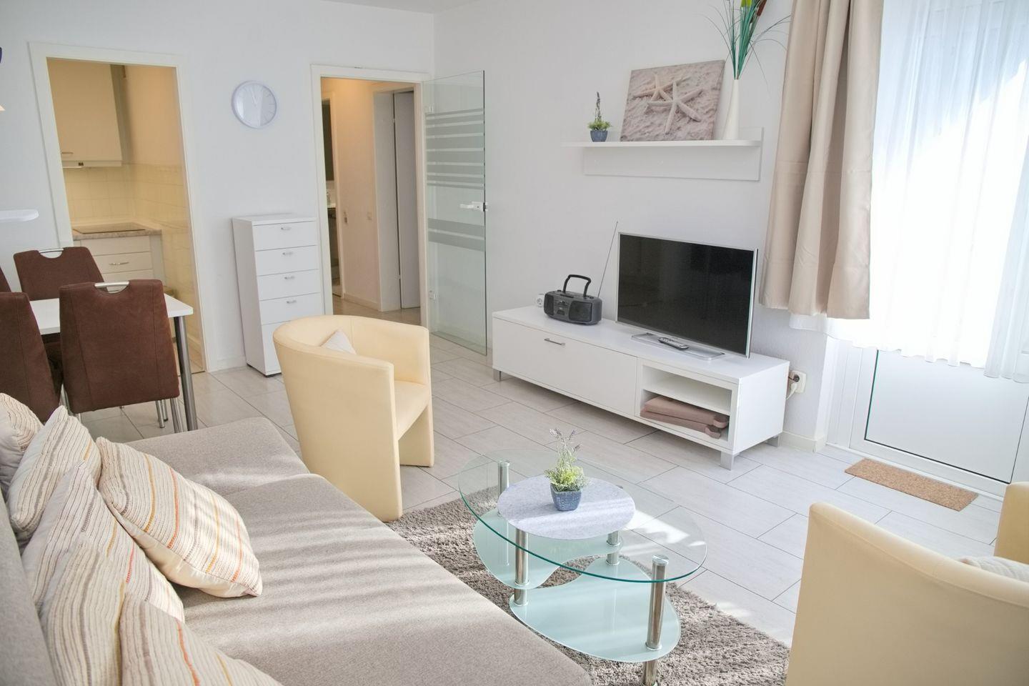 Der Wohnraum ist mit einer gemütlichen Essecke mit 4 Stühlen, einer behaglichen Schlafcouch (150 x 200 cm), zwei bequemen Sesseln, einem Flach-TV und einer Stereoanlage mit CD-Player ausgestattet.