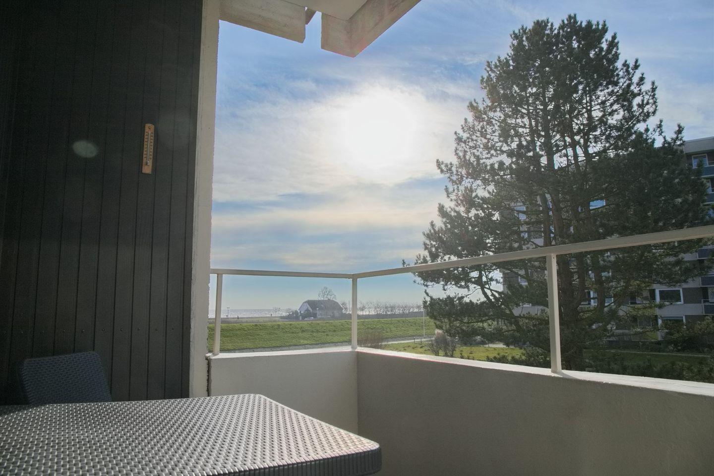 Entspannen Sie sich bei Sonne einfach mal auf dem, mit Tisch und Stühlen möblierten, schönen Balkon mit Meerblick und lauschen dem Meeresrauschen.